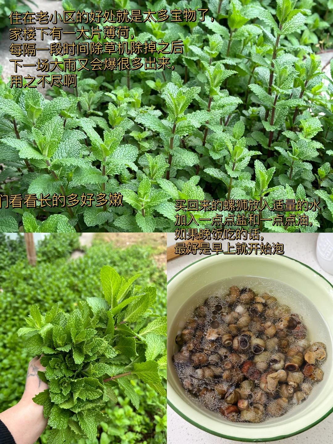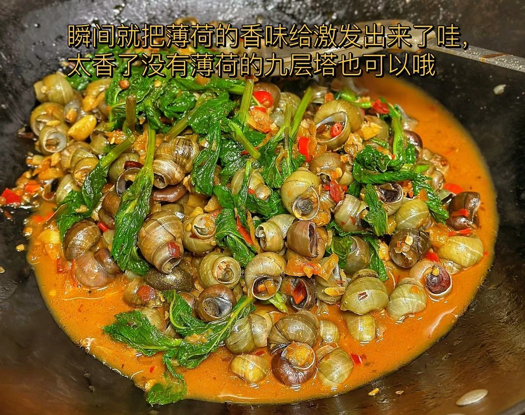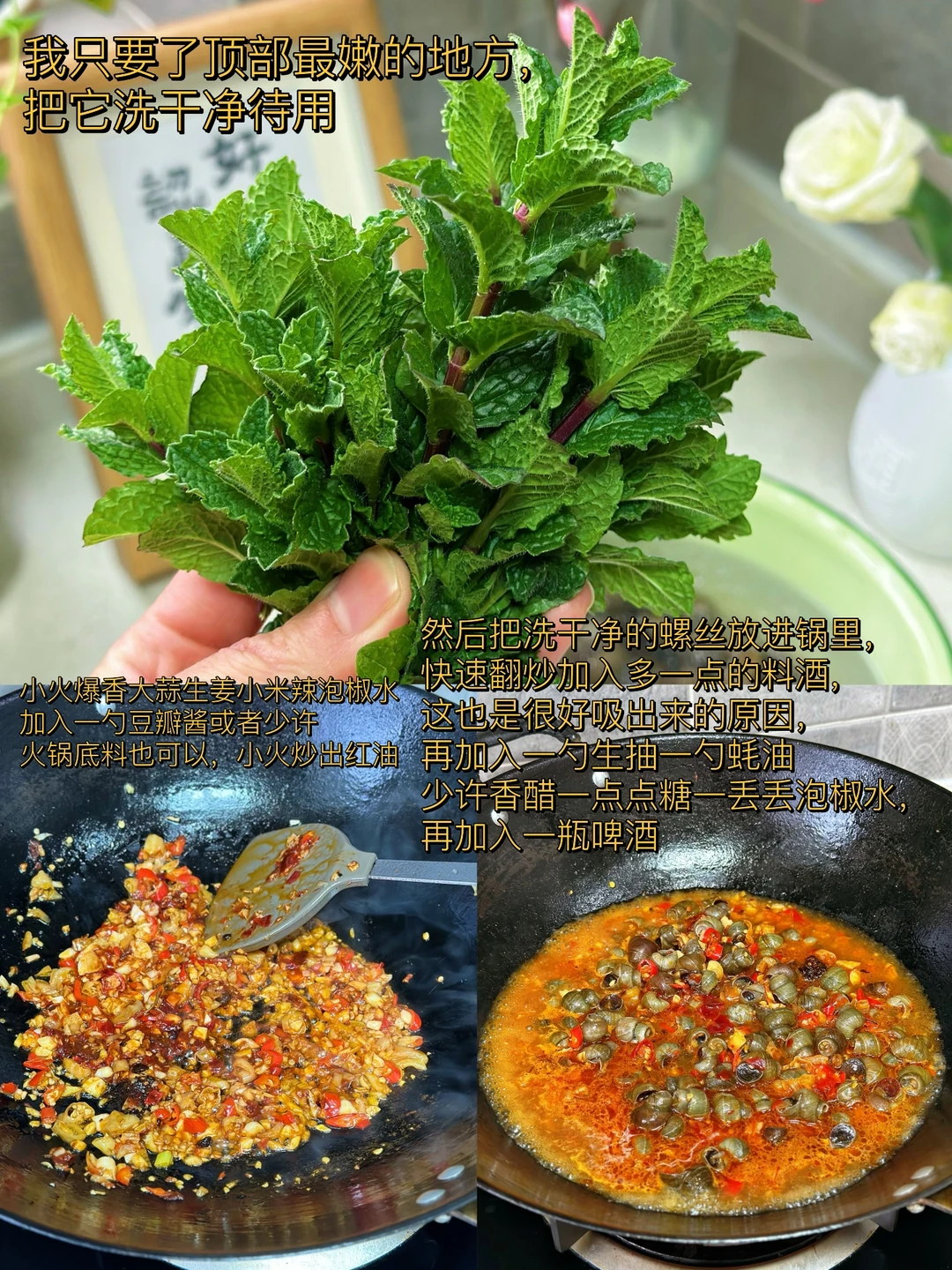 1. 住在老小区的好处就是太多宝物了,家楼下有一大片薄荷,每隔一段时间除草机除掉之后下一场大雨又会爆很多出来,用之不尽啊,给你们看看长的多好多嫩 2. 买回来的螺狮放入适量的水加入一点点盐和一点点油,如果晚饭吃的话,最好是早上就开始泡 3. 我只要了顶部最嫩的地方,把它洗干净待用 4. 小火爆香大蒜生姜小米辣泡椒水加入一勺豆瓣酱或者少许火锅底料也可以,小火炒出红油 5. 然后把洗干净的螺丝放进锅里,快速翻炒加入多一点的料酒,这也是很好吸出来的原因,再加入一勺生抽一勺蚝油少许香醋一点点糖一丢丢泡椒水,再加入一瓶啤酒 6. 盐的话一定要尝过之后再放,因为刚才放的那些东西都是有咸度的,加入鸡粉调味,出锅前熄火再把薄荷叶放进去快速翻炒匀 7. 瞬间就把薄荷的香味给激发出来了哇,太香了没有薄荷的九层塔也可以哦 8. 这样做出来的螺丝真的是超级的入味,夏日再来一瓶冰啤酒,太赞了