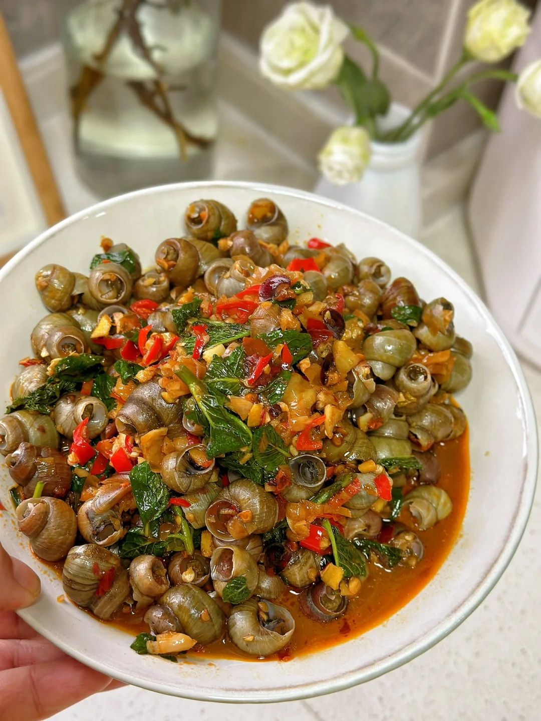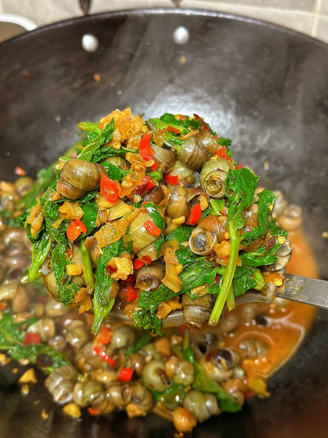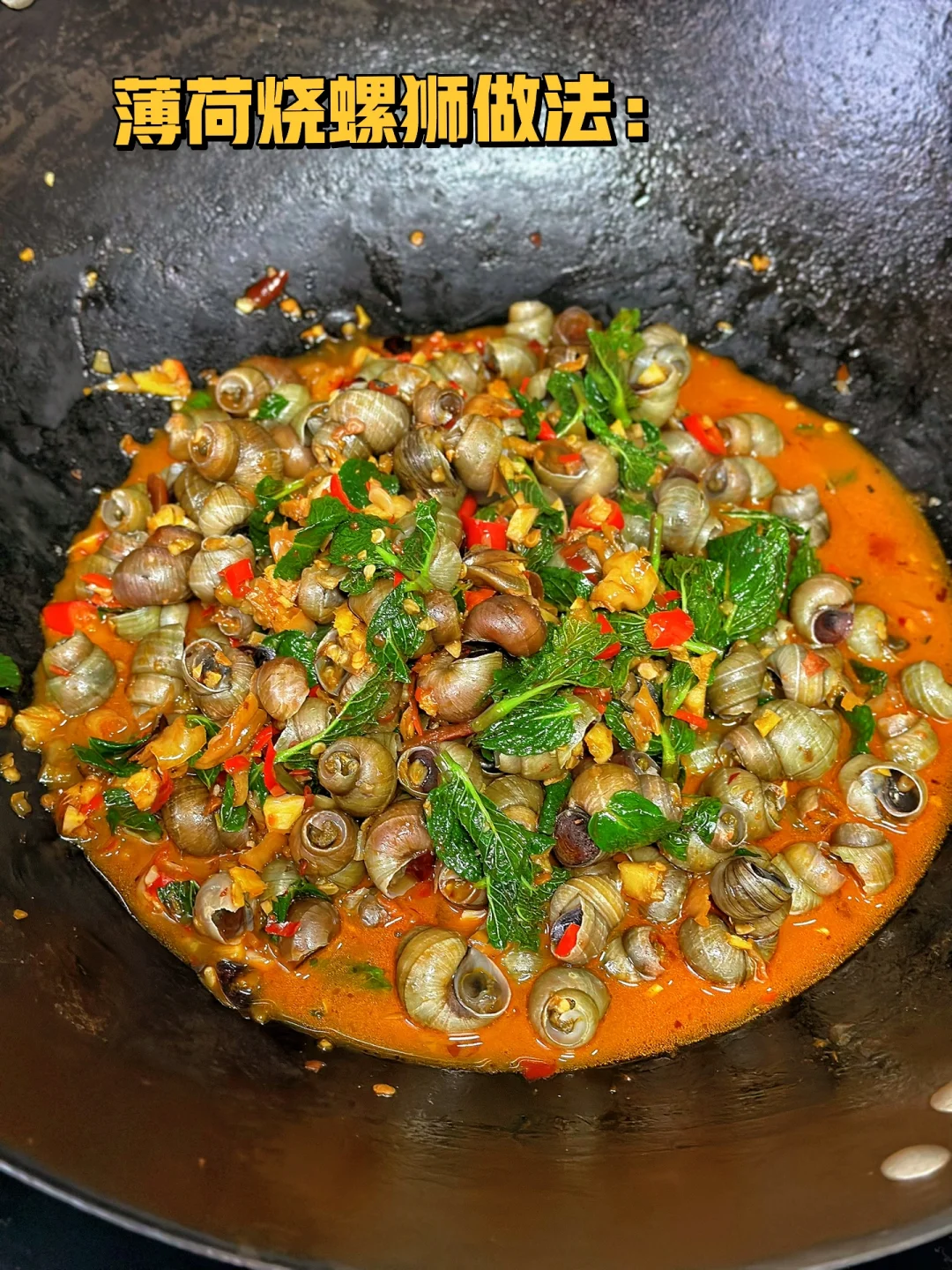 1. 住在老小区的好处就是太多宝物了,家楼下有一大片薄荷,每隔一段时间除草机除掉之后下一场大雨又会爆很多出来,用之不尽啊,给你们看看长的多好多嫩 2. 买回来的螺狮放入适量的水加入一点点盐和一点点油,如果晚饭吃的话,最好是早上就开始泡 3. 我只要了顶部最嫩的地方,把它洗干净待用 4. 小火爆香大蒜生姜小米辣泡椒水加入一勺豆瓣酱或者少许火锅底料也可以,小火炒出红油 5. 然后把洗干净的螺丝放进锅里,快速翻炒加入多一点的料酒,这也是很好吸出来的原因,再加入一勺生抽一勺蚝油少许香醋一点点糖一丢丢泡椒水,再加入一瓶啤酒 6. 盐的话一定要尝过之后再放,因为刚才放的那些东西都是有咸度的,加入鸡粉调味,出锅前熄火再把薄荷叶放进去快速翻炒匀 7. 瞬间就把薄荷的香味给激发出来了哇,太香了没有薄荷的九层塔也可以哦 8. 这样做出来的螺丝真的是超级的入味,夏日再来一瓶冰啤酒,太赞了
