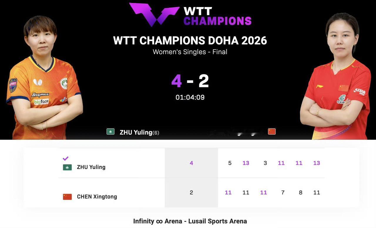 林昀儒、朱雨玲夺冠! WTT冠军赛多哈站男单决赛,林昀儒4-0张禹珍,夺得男单冠军,七局比分11-7,11-9,11-9,13-11。陈幸同2-4不敌朱雨玲,七局比分11-5,11-13,11-3,7-11,8-11,11-13,朱雨玲夺得女单冠军。