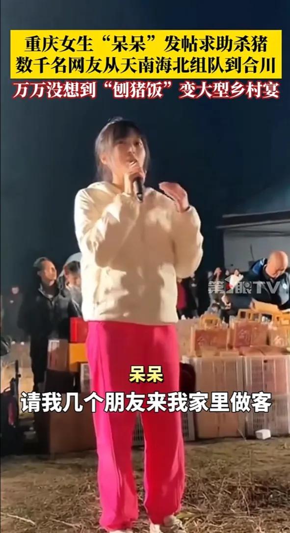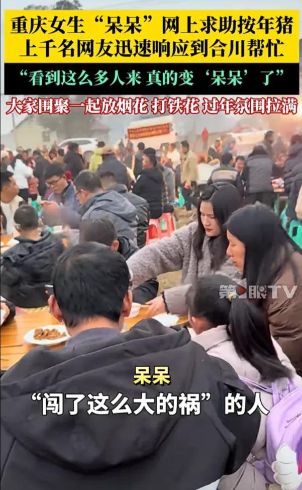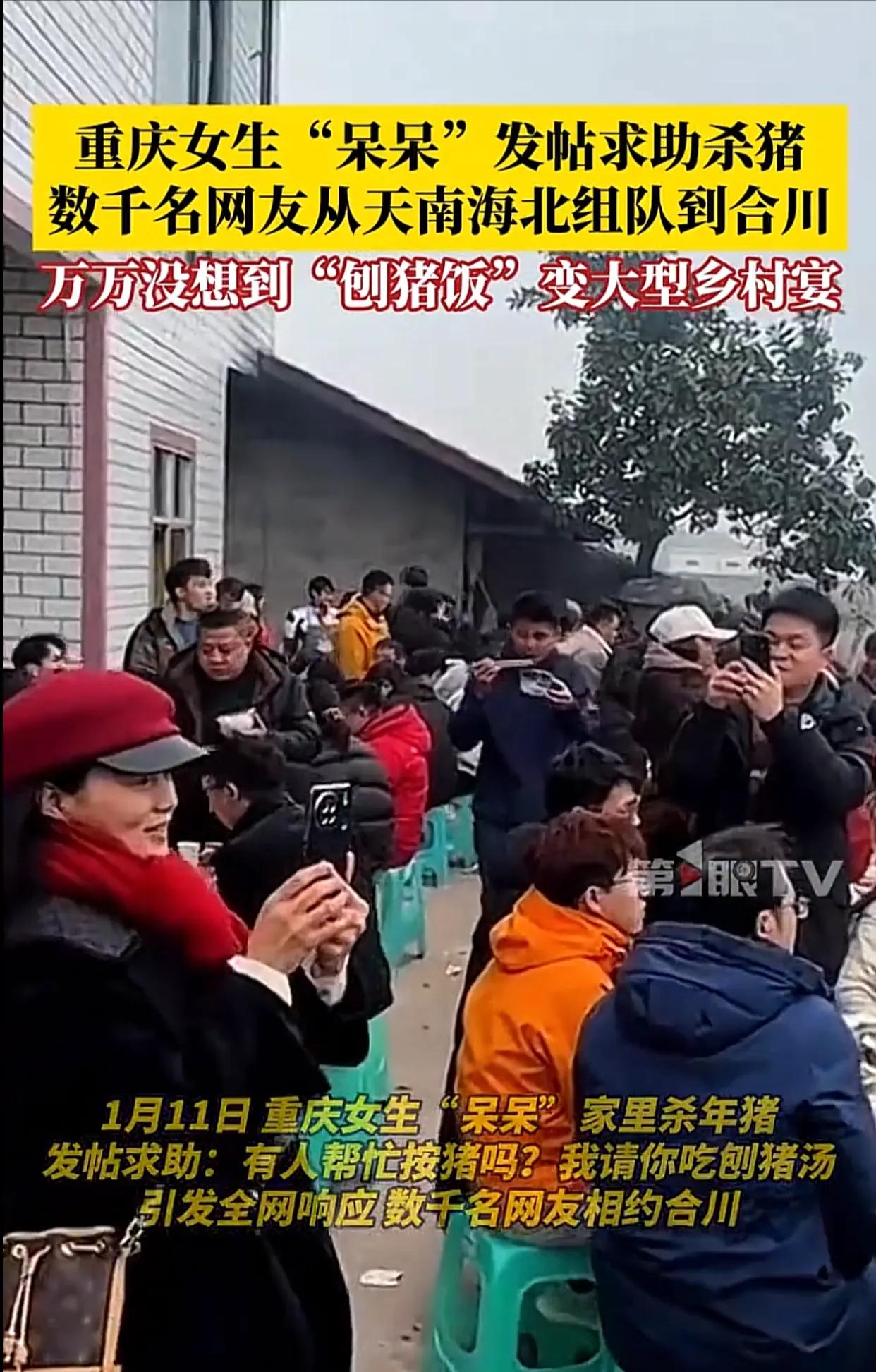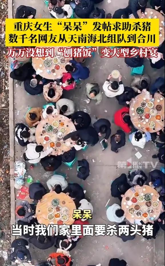 2026年第一个"闯大祸"的人出现了,重庆博主"呆呆"网上求助"按年猪",四千多名网友天南海北组团赴约。网友:把博主都吓呆了。 呆呆本来只是在社交平台随口发了条求助,说家里要杀两头年猪,缺人帮忙按猪,还说要来的朋友管吃刨猪汤。她寻思着能来十几个邻居或者本地网友就不错了,压根没把这事儿当回事,发完帖子就去忙活准备杀猪的工具了。结果帖子发出去没几个小时,评论区就炸了锅,有人喊着“重庆合川集合”,有人说“我从四川开车过来,一小时就到”,甚至还有网友订了从广东、浙江过来的高铁票,说就想凑个热闹,体验下杀年猪的年味。 等1月11日那天,呆呆站在自家院子门口,直接傻了眼。村口的马路边停满了车,从轿车到SUV排了好几里地,一眼望不到头。院子里、田埂上全是人,粗略数下来得有四千多人,有扛着相机的摄影爱好者,有提着土特产的热心网友,还有带着孩子来体验乡村生活的年轻父母。原本计划的“小型刨猪汤”,硬生生变成了千人规模的乡村宴,呆呆站在人群里,嘴张得老大,后来自己都调侃“看到这么多人来,我是真的变‘呆呆’了”。 杀猪的环节更是热闹得离谱,十几个壮汉一起上阵按住年猪,周围的网友举着手机咔咔拍照,还有人现场直播,弹幕里全是“太有年味了”“这阵仗比过年还热闹”。杀完猪后,呆呆家的院子里摆开了几十桌酒席,刨猪汤、腊肉、香肠摆满了桌子,网友们一边吃一边唠嗑,陌生的人因为这一场意外的相聚变得热络,有人还现场放起了烟花、打起了铁花,乡村里的年味儿一下子拉满了。 呆呆家原本只准备了两头猪的食材,面对四千多人的队伍,只能紧急联系村里的乡亲们帮忙,宰鸡杀鸭、煮菜做饭,忙得脚不沾地。村口的交通也因为来的车太多堵了好几个小时,当地的交警还特意过来疏导交通。有网友开玩笑说“呆呆这是把全网的热心人都招来了,怕是年后得天天吃刨猪汤才能还清人情”。 这事看着好笑,其实也戳中了很多人心里对年味的向往。现在城里的过年氛围越来越淡,贴春联、吃年夜饭都少了点传统的热闹,杀年猪、吃刨猪汤这种乡村习俗,反而成了很多人怀念的年味符号。呆呆的一次无心求助,意外成了一场全民的年味狂欢。 各位读者你们怎么看?欢迎在评论区讨论。