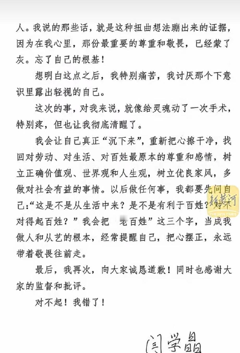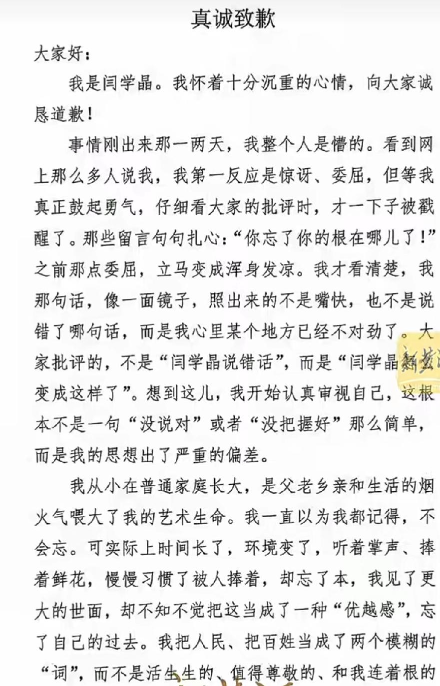 闫学晶发文道歉了,你能接受吗?终于在铺天盖地的舆论压力之下认怂了,但是看她写的这个信真的有诚意吗? 我都怀疑她的信是她工作室写出来的,最后只是勉为其难的签了一个名字。 真的很奇怪,如果是自己写的信,怎么会前面是打印的字,只有名字是手写的。 没办法,这一次老百姓是真的醒悟了,高高在上的明星,再牛再厉害也都是老百姓捧起来的,自己成了明星之后,第一件事居然就是看不起群众。