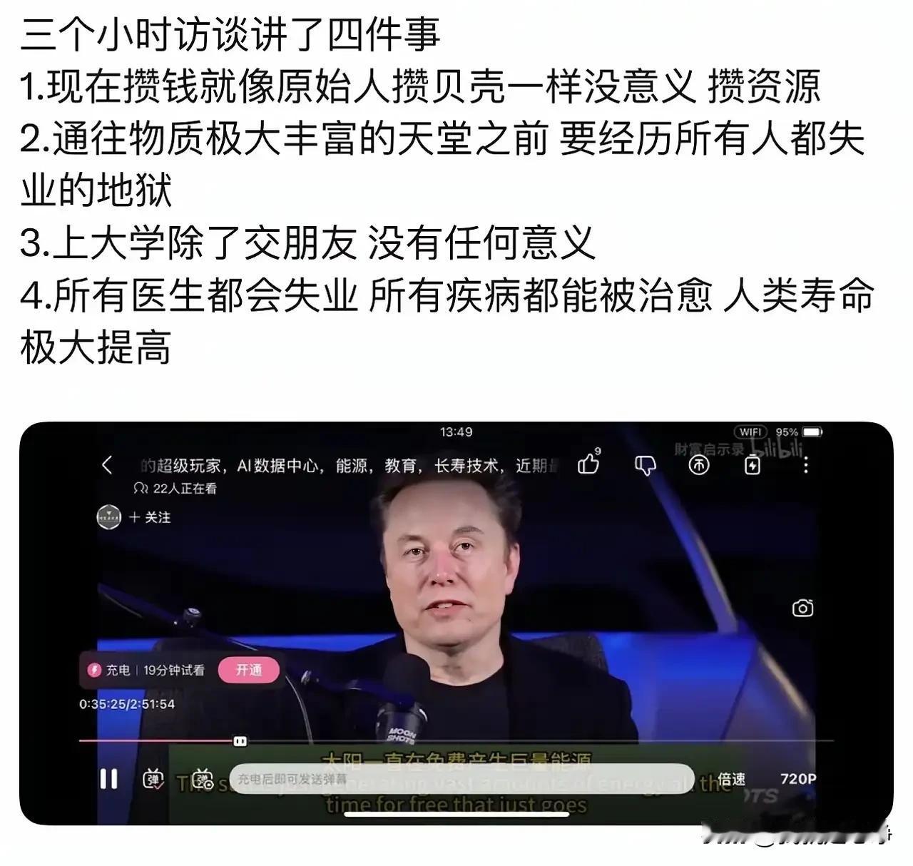 马斯克这种人属于是典型的科技怪咖,普通人很难理解他们的脑回路。 他们总是站在科幻世界的角度来看待这个世界。 其实按照马斯克的脑回路来分析未来的世界。 人类世界只要解决能源供应的问题,那么其实是可以解决温饱的。 未来的世界,人类将不用依赖工作就可以解决衣食住行的问题。 真到了那个时候,大量的工作岗位将会锐减消失。 金钱也就没有什么重要的意义了。 未来决定人类世界运转的价值标的物应该是能源。 也就是电力。 只要你拥有充沛的电力,那么大力发展ai产业,可以替换掉很多很多工作岗位。 物质极大丰富的时代来临,工作毫无意义。 当然了,这是马斯克对未来的一个展望。 算是一个百年的愿景吧。 短时间看是不太现实的。