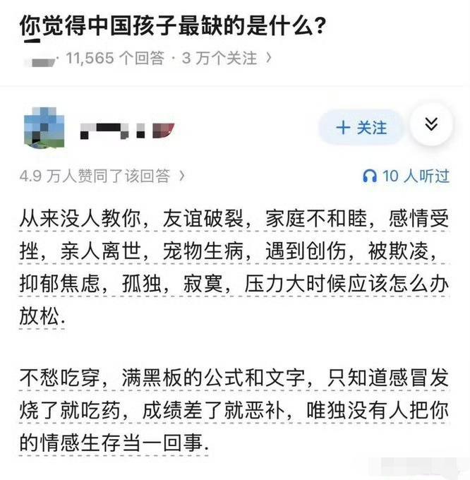 说出了很多人的心声,我们这代人就是这么过来的,希望下一代能有更多情感教育的机会。
