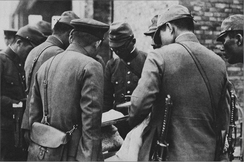 1937年7月28日,北平,南苑战役期间,日军向南苑中国守军发起总攻。凌晨起,日军在香月清司指挥下,动用第20师团、关东军独立混成旅团等部队,配合大量飞机、大炮和坦克,从多个方向猛攻南苑兵营。中国国民革命军第29军约5000-8000名守军,佟麟阁副军长统率的军直属部队、赵登禹第132师一部,以及1500多名大学生军训团学兵仓促应战,进行了顽强抵抗。 从拂晓开始对南苑兵营进行了猛烈轰炸,投下大量炸弹,造成营房、骑兵马匹和后方机关严重损失,地面随后跟进坦克与步兵冲击。这张照片从日军视角记录了他们进攻得手后,军官们围在一起查看轰炸效果报告的情形。 这场战斗持续到下午,南苑最终失守,中国守军伤亡超过5000人,大学生军训团几乎全军覆没,仅少数人突围,日军也付出一定代价,伤亡约1300人左右。次日,北平沦陷。