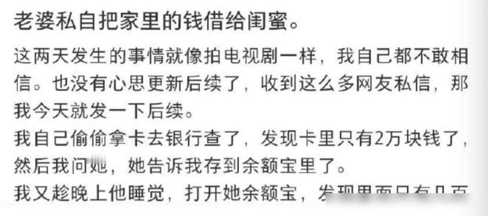 河南,一男子发工资后立刻把一万多转给了妻子,可他想留1000和朋友吃饭,却遭到妻子拒绝,可没过两天,男子却发现,妻子竟然背着他,偷偷把家里30万转给了她的弟弟用于结婚,这下男子彻底绷不住了。 一个把工资卡捂得热乎立刻上交的男人,居然连申请一千块钱跟哥们儿吃顿饭的资格都没有。这种极端的“严管”,最终却扯出了一桩让人背脊发凉的“家贼”案。 如果不是这次卑微的请款被拒,这位丈夫可能至今还活在妻子编织的幻象里,以为自己这几年辛苦攒下的积蓄正安稳地躺在账户里生息。 男人平时老实巴交,工资一发就全数转给媳妇,主打一个绝对信任。可那天想留一千块钱聚个餐,硬是被妻子一顿数落给驳回了。这种对“小钱”的严防死守,反倒激起了男人的逆反心理和疑心。 既然一千块都这么紧,那家里的“大钱”还在不在?银行卡里原本厚实的积蓄,竟然缩水到了只剩两万多。 面对质问,妻子起初还妄图以“转至支付宝理财”之借口来敷衍塞责,试图蒙混过关,却不知真相终难掩盖。可当半夜男人趁妻子睡着翻看手机时,支付宝余额里那孤零零的“两百块”,彻底击碎了最后一点幻想。整整三十万现金流,就这样人间蒸发了。 在这个节骨眼上,妻子还在试图用谎言给这个巨大的窟窿打补丁。她言之凿凿,声称那笔钱是借给闺蜜用于生意资金周转了。还笃定表示,只需待到过完年,这笔钱便能悉数归还。这种理由听起来似乎合情合理,毕竟谁没个急需用钱的朋友? 但男人已经不再是那个只知道上交工资的“傻白甜”了。一通电话打过去核实,对面的闺蜜一听这事儿,立马就把底给漏了根本没借钱这回事,那不过是妻子拉她出来挡枪的借口。 这层窗户纸一捅破,真相才赤裸裸地摆在面前:家里的积蓄被“搬运”到了娘家。那三十万并不是借出去了,而是变成了一场盛大的“扶弟”行动。十八万用来给弟弟当彩礼,剩下的钱还贴心地给弟弟配了辆车。 让人最无法接受的,不仅是钱没了,而是妻子那种理直气壮的态度。在她看来,这三十万仿佛是她应得的“精神损失费”。她反复强调,自己因为生孩子耽误了工作,婆婆又不来帮忙带娃,所以她在这个小家里受了委屈。 这种逻辑形成了一种可怕的闭环:因为我在婆家受了累,所以我拿夫妻共同财产去补贴娘家是天经地义的。她似乎完全忘记了,这三十万不仅仅是一个数字,那是丈夫没日没夜工作、连一千块都不舍得花的血汗钱,也是当初结婚时亲朋好友凑出的礼金。 她把对生活的怨气,转化成了对娘家弟弟毫无底线的纵容。孩子是两个人的责任,怎么到头来,承担经济苦果的只有丈夫一个人?这种把小家的血抽干去滋养大家的行为,本质上就是一种家庭角色的严重错位。 从法律层面讲,婚后所有的收入、积蓄,只要没有特殊约定,那都是夫妻共同财产。一方掌管财政大权,那是基于信任的代理,绝不是意味着拥有了独断专行的处置权。 哪怕是出于亲情想要帮衬弟弟,这种涉及家庭根基的大额支出,最起码的尊重是“商量”。一千块钱的聚餐费都要被否决,三十万的巨款却能瞒天过海,这种双标才是最伤人的。 这事儿在网上发酵后,很多人说这是“扶弟魔”的典型,其实更深层的是婚姻里边界感的全面崩盘。在这个家里,丈夫被当成了单纯的“供款机器”,而妻子则扮演了一个既掌控资源又毫无契约精神的“独裁者”。 但比钱更难修复的,是那种“被枕边人算计”的寒心。当查账需要像搞刑侦一样抽丝剥茧,当最亲密的人变成了最需要防备的“内鬼”,这日子的地基,其实已经塌了。