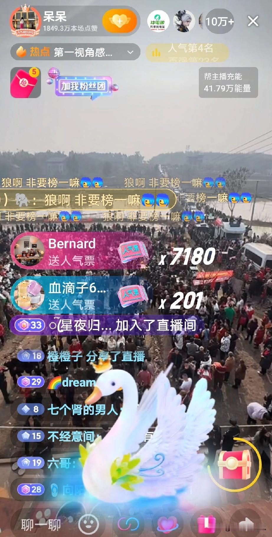 没想到网红“呆呆”因为sha两头年猪竟然爆红, 现在她们家门口人山人海,就跟全红婵家一样。 特别热闹。 然而我上午看到呆呆的账号粉丝才40多人, 现在一看竟然快达到80万了, 呆呆的直播间10万人在观看,很多网友不是刷跑车就是热气球,还有刷小天鹅都 估计一场直播不但两头猪钱就回来了,还得赚上一笔