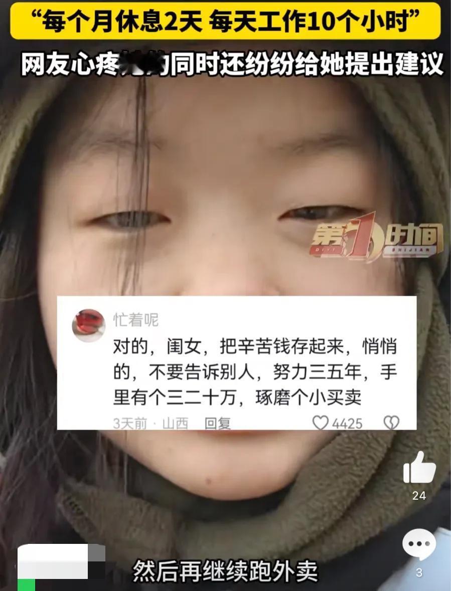 太真实了!四川成都,一女生在网上分享,自己送外卖送了一年,攒下了50000块钱,觉得挺满意。但听完她具体怎么做的,很多人反而心疼起来,甚至纷纷给出人生建议. 在成都,一个普通的存款数字意外撕开了当下打工人的遮羞布。一位年轻女孩在外卖行业摸爬滚打整整一年,账户里多出了五万元。乍一听,这成绩单挺拿得出手,甚至让不少月光族羡慕。 但当账本翻开,那些藏在数字背后的“代价”才真正让人心里发酸。这哪里是轻松攒下的积蓄,分明是把生活压缩到了极致,用汗水和时间硬生生置换出来的血汗钱。 这五万块钱的重量,恐怕只有女孩自己掂得清。没有所谓的职场技巧,全靠身体硬扛。为了存下这笔钱,她把自己变成了一个不知疲倦的陀螺,每天十个小时的高强度运转是标配,一个月仅仅给自己留出两天的喘息时间。 收入的曲线随着天气剧烈波动。酷暑难耐的旺季,为了那每天四百元左右的进账,她得顶着烈日穿梭在大街小巷。到了淡季,同样的奔波可能只能换回两百出头的回报。一年下来,平均每个月攒下四千块,这每一分钱上都写满了“不容易”。 这不是简单的加减法,而是对体能极限的反复试探。在这个物价高企、生活成本只增不减的城市里,能从牙缝里省出这笔钱,除了拼命,别无他法。 更有意思的是围观群众的反应。并没有多少人盲目鼓吹“勤劳致富”,评论区反而充斥着一种近乎残酷的“人间清醒”。大家心疼之余,给出的建议极其现实:一定要守住这笔钱,甚至要学会“伪装”。 特别是那些经历过生活毒打的“过来人”,千叮万嘱地告诉她:财不外露是铁律。哪怕是面对家里的兄弟姐妹,也不要轻易透底。别人问起来,标准答案永远是“刚够糊口”。 这般谨小慎微的生存智慧,所折射出的,恰是普罗大众对财富安全深切的忧虑,在生活的浪潮中,那焦虑如影随形,令人心忧。在人情社会里,显露的积蓄往往不是底气,而是麻烦的导火索。学会适度“哭穷”,在这个复杂的环境里,竟成了一种必要的自我防御机制。 女孩的经历宛如明镜,清晰映照出当下社会理财观念正经历着急剧转变。这一转变,不仅是时代的印记,更值得我们深入思索其背后的缘由与影响。没人劝她去搏一把大的,相反,所有声音都在喊“稳住”。大家都在劝她断了那些高风险投资的念头,别想着钱生钱,能把本金攥在手心才是硬道理。 于那些欲转行或涉足新领域之人而言,这无疑是一堂鲜活且极具警示意义的风险教育课,能让他们在前行路上多一份审慎与思量。没有经过几个月的实地考察,千万别轻易丢掉现在的饭碗。那种“搏一搏,单车变摩托”的激进思维,早已被“落袋为安”的求稳心态取代。 无论是在烈日下奔波的外卖骑手,还是在写字楼里加班的白领,大家的共识惊人的一致:在充满不确定性的时代,守住已有的劳动成果,比追求虚无缥缈的高收益来得实在得多。 归根结底,这不只是一个关于五万元的故事,而是无数灵活就业群体生存状态的缩影。他们宛如城市血管中默默流淌的红细胞,以自身之力维系着都市的有序运转。然而,这般重要的他们,却常常沦为最易被世人忽视的群体。 每一份靠双手挣来的钱都值得被尊重,那些脚踏实地的努力,依然是通向未来最可靠的路。但也想给所有像女孩一样拼命的人提个醒:日子终究是过出来的,不是算出来的。 毕竟,我们努力赚钱的初衷,是为了更好地生活,而不是为了在数字的累积中,耗尽了感受生活的力气。