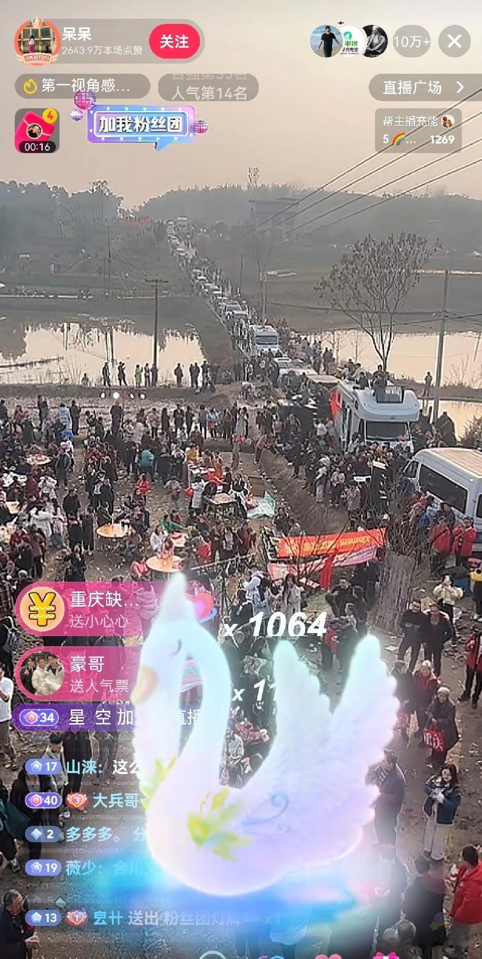 一生爱凑热闹的中国人, 网友呆呆,发了帖子,说请网友1月11日来按猪,就为了让门口停满车,在村里扬眉吐气一回。 然后很多网友去凑热闹,然后门口堵车了,合川文旅直接下场,还送了两头猪。 早上呆呆的粉丝十几万,现在快突破百万了,直接人数10万+。