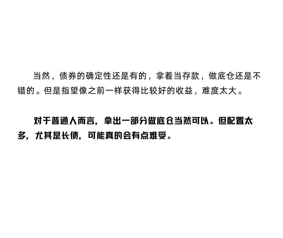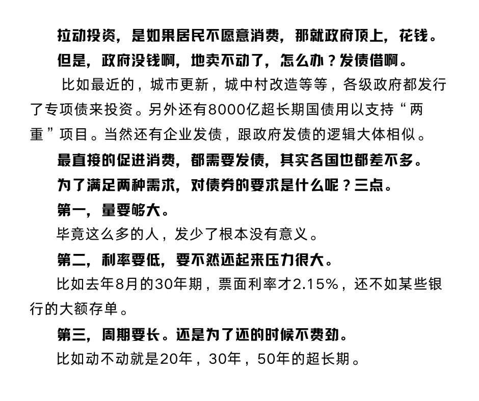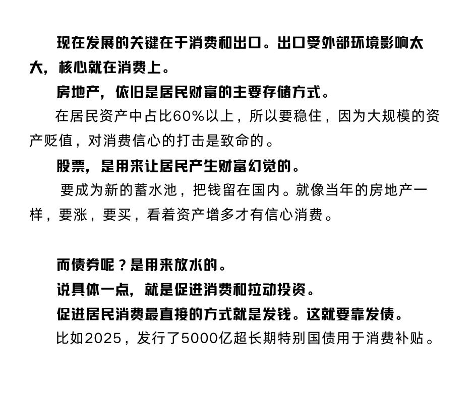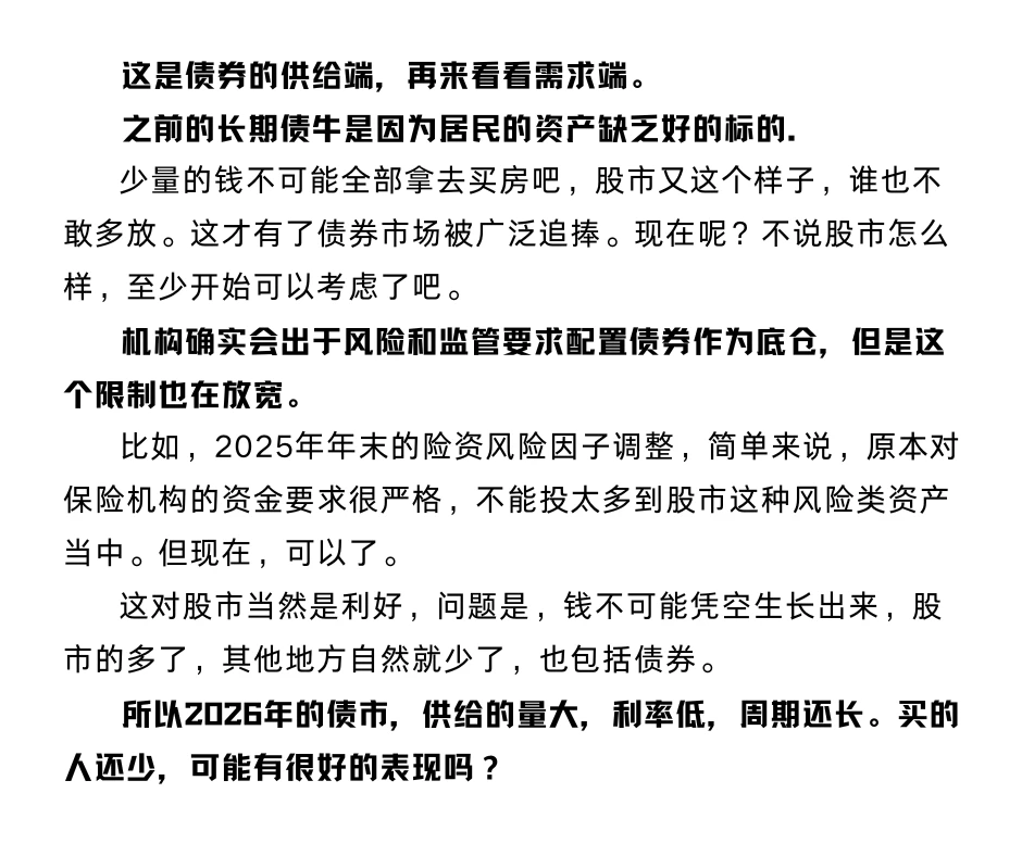 财经知识 理财 股市 宏观经济 债基 直接说观点,我不看好2026年的债券市场。这是由当前债券在经济发展中的定位决定的。 在我们国家各种标的,本质上都是金融工具,服务于国家的整体经济发展。 所以房、股、债是需要联动观察的,看看分别发挥什么作用。 现在发展的关键在于消费和出口。 出口受外部环境影响太大,核心就在消费上。 房地产,依旧是居民财富的主要存储方式。 在居民资产中占比60%以上,所以要稳住,因为大规模的资产贬值,对消费信心的打击是致命的。 股票,是用来让居民产生财富幻觉的。 要成为新的蓄水池,把钱留在国内。就像当年的房地产一样,要涨,要买,看着资产增多才有信心消费。 而债券呢?是用来放水的。 说具体一点,就是促进消费和拉动投资。 促进居民消费最直接的方式就是发钱。这就要靠发债,比如2025年,5000亿超长期特别国债用于消费补贴。 拉动投资,是居民如果不愿意消费,那么就政府顶上,用投资的方式来花钱。 但是,政府没钱啊,地卖不动了,怎么办?发债借啊。 比如最近的,城市更新,城中村改造等等,各级政府都发行了专项债来投资。另外还有8000亿超长期国债用以支持“两重”项目。当然还有企业发债,逻辑大体相似。 为了满足两种需求,对债券的要求是什么呢?三点。 第一,量要够大。 毕竟这么多的人,发少了根本没有意义。 第二,利率要低,要不然还起来压力很大。 比如去年8月的30年期,票面利率才2.15%,还不如某些银行的大额存单。 第三,周期要长。 还是为了还的时候不费劲,比如动不动就是20年,30年,50年的超长期。 这是债券的供给端,再来看看需求端。 之前的债牛是因为缺乏好的标的,钱不可能全部拿去买房吧,股市又这个样子,谁也不敢多放。这才有了债券市场被广泛追捧。现在呢?不说股市怎么样,至少可以考虑了吧。 机构确实会出于风险和监管配置债券作为底仓,但是也在放宽。 比如,2025年年末的险资风险因子调整,原本对保险机构的资金要求很严格,不能投太多到股市这种风险类资产当中。但现在,可以了。这对股市当然是利好,问题是,钱不可能凭空生长出来,股市多了,其他地方自然就少了,也包括债券。 所以2026年的债市,量大,利率低,周期还长。买的人还少。。。 当然,债券的确定性还是有的,但是指望像之前一样获得比较好的收益,难度太大。 对于普通人而言,拿出一部分做底仓当然可以。但配置太多,尤其是长债,可能会有点难受。