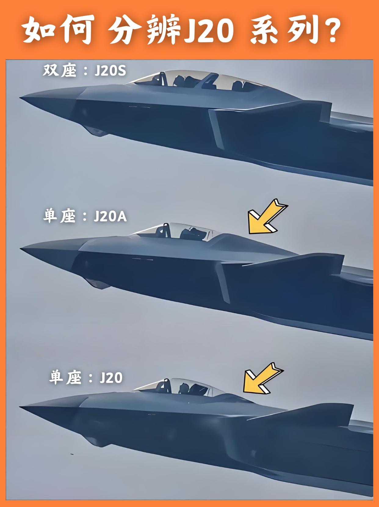 J20系列分辨指南:外观与配置双维度判定! J20系列含基础型、J20A改进型及J20S双座型,可通过外观特征与核心配置差异精准分辨,以下为专业判定要点。 1. 外观核心差异:基础型J20座舱盖后机背线条平直,涂装多为浅灰色;J20A座舱后机身隆起呈“驼背”状,涂装以深黑或低可视灰为主;J20S最显著特征为串联双座布局,座舱盖拉长且后座玻璃框清晰可辨,机背更宽。 2. 配置辅助判定:基础型早期搭载俄制AL-31发动机,后期换装WS-10C;J20A标配国产WS-15发动机,航电系统升级为氮化镓雷达;J20S因需指挥无人机,增设专用战术指挥航电模块。 综上,先通过座舱与机背外观快速归类,再结合动力、航电配置验证,可实现J20系列型号的准确分辨,为装备识别提供专业依据。