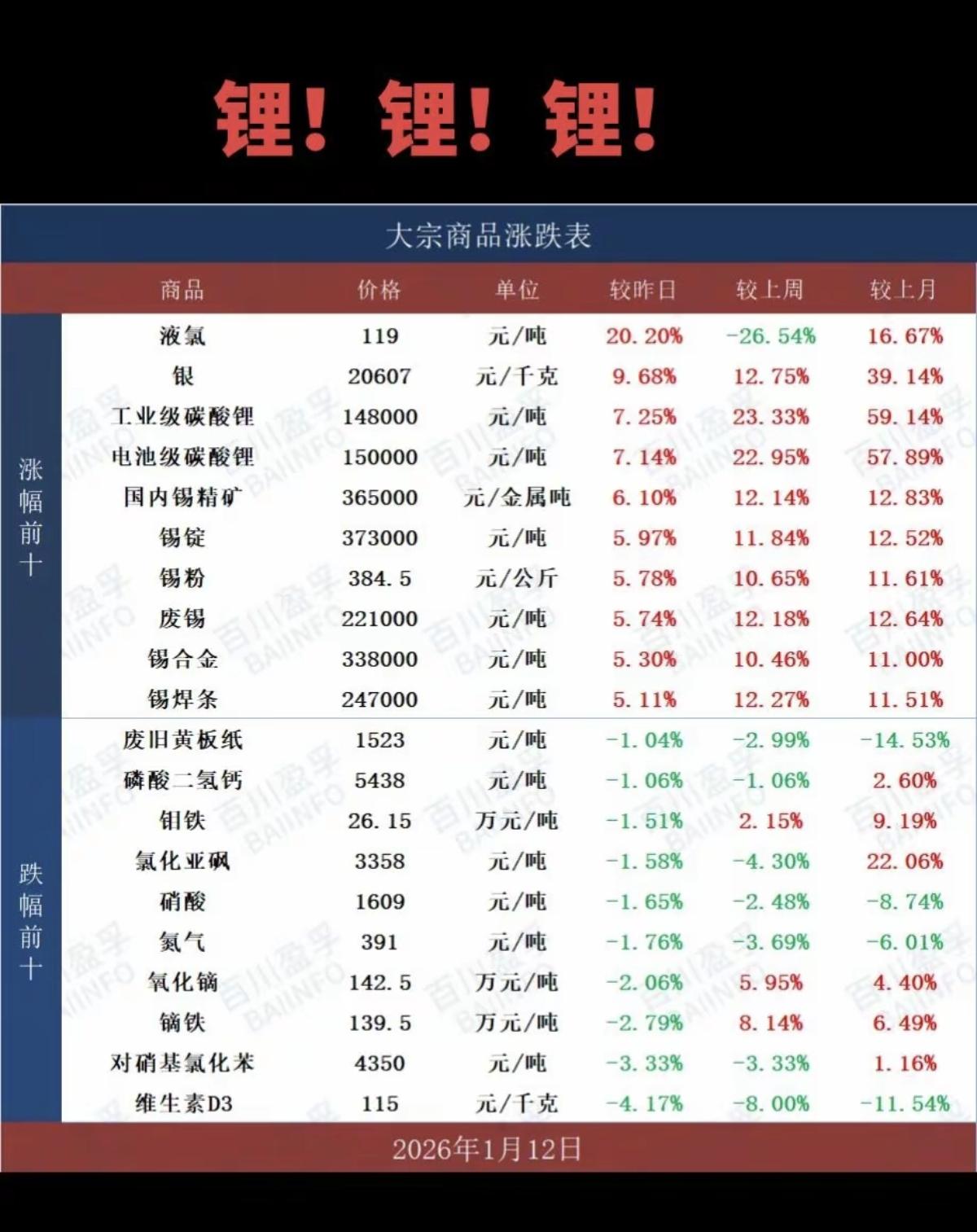 1.12周一 最新:大宗商品涨跌表! 能源金属碳酸锂,期货价格继续上涨。最新报价接近15万元/每吨,又创新高了。 锡,银金属价格,继续上涨。