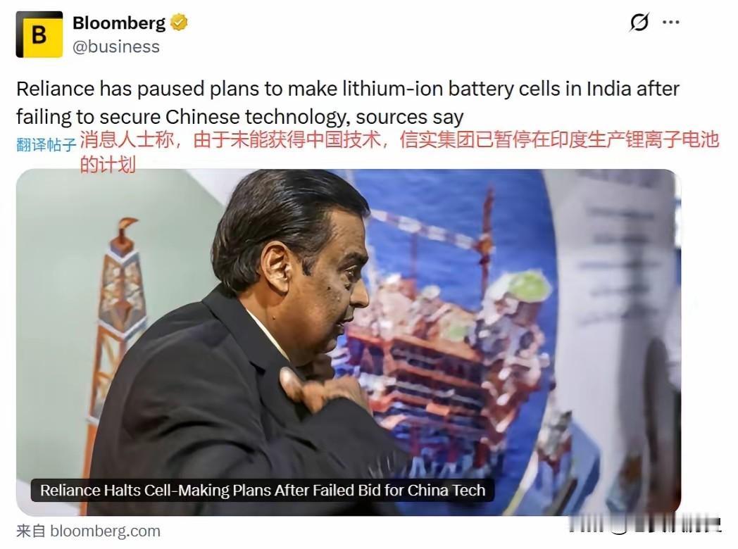 没有中国支持,印度暂停锂电池生产 1月12日,根据彭博社的报道,由于无法获得来自中国的技术,印度信实集团已经暂停生产锂离子电池的计划。 这则消息读起来,倒颇有几分求锤得锤的味道。印度首富、亚洲首富穆克什·安巴尼麾下的工业巨舰,竟然因为拿不到中国技术而搁浅,这剧情本身就很能说明问题。 信实工业的雄心很大,想要从石油大亨变身新能源巨头。但理想很丰满,现实却很骨感。自己搞不出核心的电芯技术,转头想找中国企业“借东风”,结果碰了壁。内部评估说得直白:不用中国技术,成本飙升,风险巨大,根本玩不转。 他们不是没找过别的出路,日本、欧洲、韩国的技术都掂量过,结论是更贵、更没竞争力。这就像一个想自己做饭的人,发现离了现成的优质食材和配方,从零开始种地研菜谱,简直难如登天。 更讽刺的是,印度政府为了打造本土电池产业链,是掏了真金白银补贴的,最高能补141亿人民币。可信实旗下的新能源公司,连阶段目标都没完成,已经吃了罚单。补贴也催生不出核心技术,这困境可见一斑。 事情发生后,信实工业连忙否认战略生变,说一切按计划推进。但明眼人都看得出,所谓的“推进”已经变了味道,重心从制造核心电芯,退回到了组装储能系统。这相当于从想自己炼钢造车,退回到买零件来组装。 印度的困境,根源在于其矛盾的战略:既想排斥中国,又离不开中国。 一面在投资和市场准入上对中国企业设置重重壁垒,另一面其制造业的命脉又深度依赖中国的供应链和技术。印度市场超七成的锂电池进口自中国,前五大供应商里中国占了四席。这种“既要又要”的心态,在现实的技术高墙前,难免碰壁。 中国加强关键技术的出口管制,是必然的一步。这并非刻意针对谁,而是保护数十年积累的产业优势和知识产权。当合作缺乏基本的公平与互信时,技术的大门自然会关紧一些。 信实的这次挫败,不过是印度新能源自主梦艰难曲折的一个缩影。从光伏到电动车,类似的故事不断上演。庞大的市场需求与脆弱的本土供应链之间,存在着刺眼的断层。 这场“技术卡脖子”的戏码,生动地揭示了一个道理:在全球化的产业棋盘上,真正的主动权来源于不可替代的核心能力。简单的市场保护或资本补贴,造不出尖端技术;以邻为壑的排挤政策,更换不来真诚的合作。当印度企业不得不面对“没有中国技术支持就暂停”的现实时,或许正是重新审视何为真正互利共赢的时候。 各位读者你们怎么看?欢迎在评论区讨论。 中国锂产业 中国电池产业 锂电池出口英国 锂电池产品出口 欧洲锂电池危机