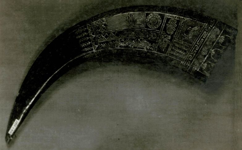 在29件套文物中,丢失日期最早的要追溯到1986年。丢失文物是一个有苗族彩绘渔猎图案的酒角。酒角为牛角加工,为苗族喜庆饮酒用具。角首刻绘虎、鹿、马、鱼、蛇、蜈蚣、蝴蝶、飞鸟及八卦、箭羽、云、雷等几何图案。此外,角尖还有一穿孔,便于系带。