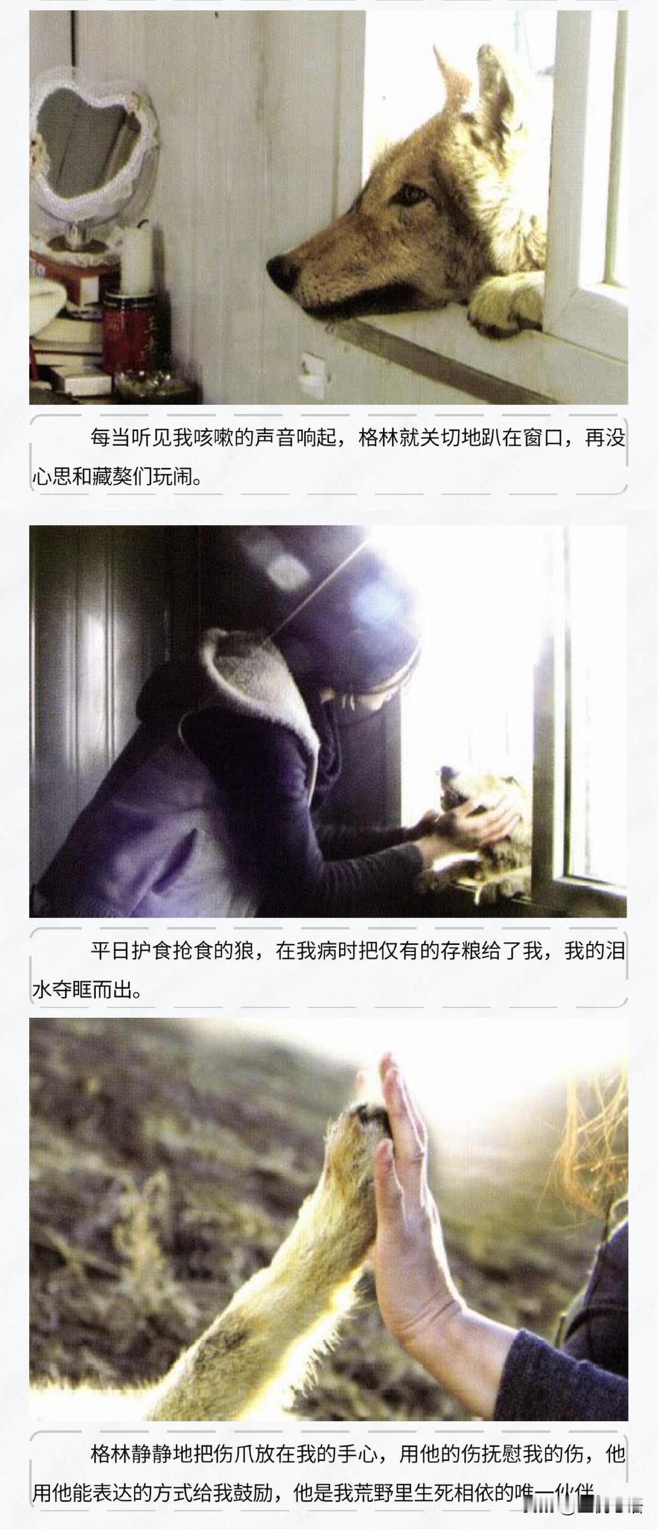 看《重返狼群》哭到窒息! 格林的温柔太感人了。 感觉心里又暖又疼。 格林真的把我整破防了! 人类杀了它的孩子, 让它对同类充满戒备, 可它偏偏是被人类妈妈李微漪养大的。 它会在妈妈咳嗽时守在窗边,会把仅有的存粮让给生病的妈妈,会用受伤的爪子轻轻抚慰妈妈的伤口。最让我泪目的是,妈妈掉冰河里受伤,它居然能翻山越岭牵来牧民的马,还直立起身帮妈妈上马。 七年珍藏的红腰带,是它对妈妈最深的牵挂,可最后却只能远远相望,连碰面都不敢。反观有些人类,危难时刻最先想到的是自己逃跑。 其实地球从来不是人类独有的,每一个生灵都该被善待。格林用行动告诉我们,善良和爱不分物种。愿15岁的格林平安顺遂,也愿更多人能明白,与自然和谐共处,才是最长久的生存之道。
