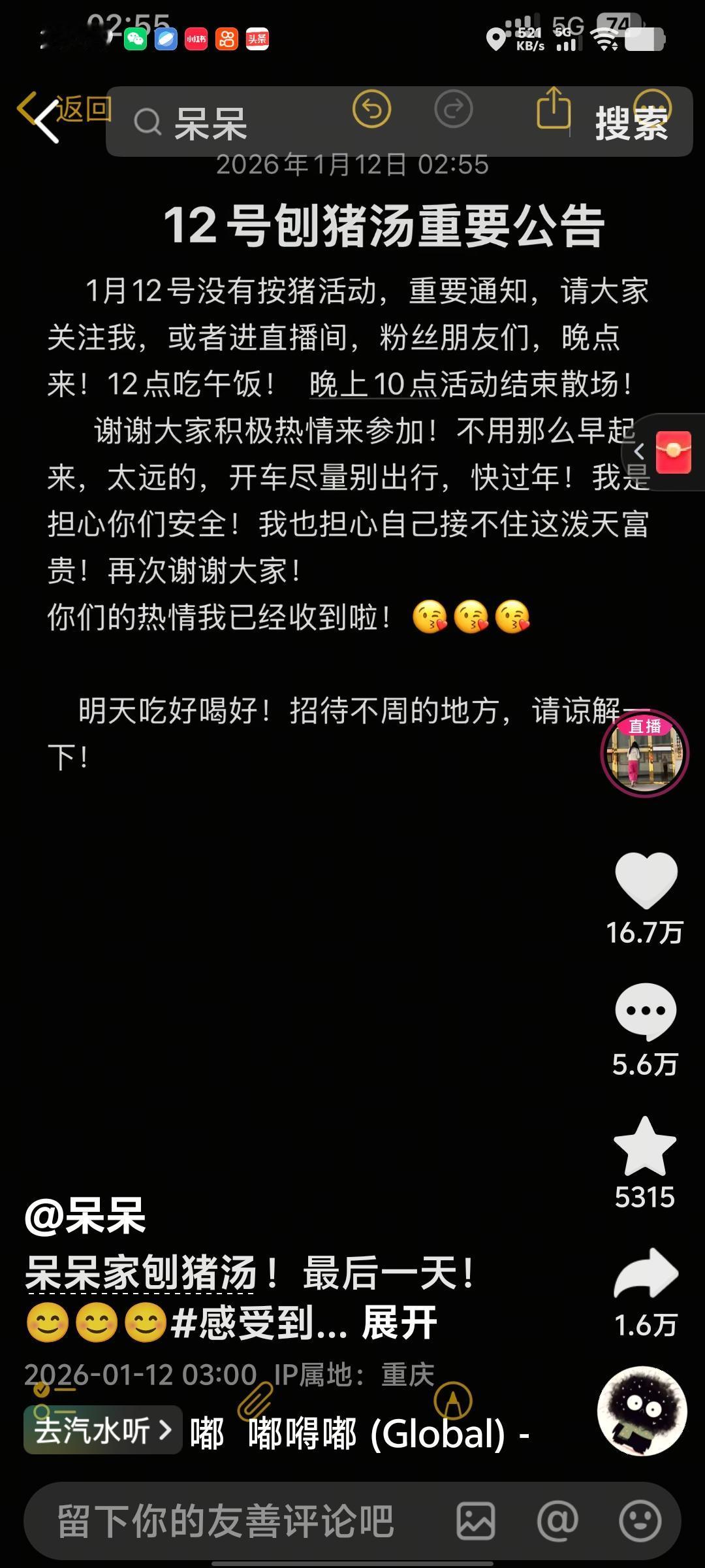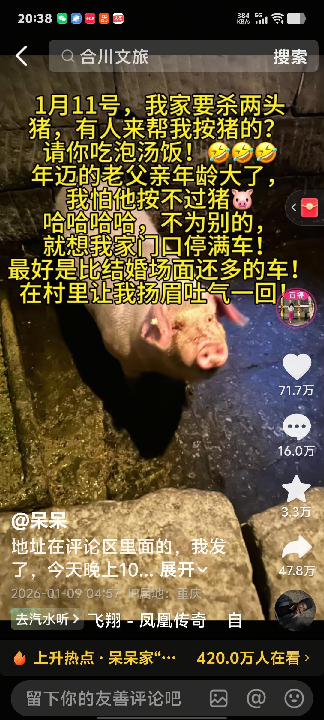 145万粉丝的呆呆直播间10万+,榜一大哥狂刷嘉年华。宣传家乡的美甲女孩太圈粉。 呆呆抖音账号的粉丝达到了145万。直播间人数10w+,嘉年华等各种礼物刷不停。 这个点天已经黑了。在大地里燃起篝火。现场围着好多好多人,感觉至少有几千人。 还有好多人都在举着手机直播。呆呆在忙事情,所以让朋友帮忙直播。 现场除了篝火人群,还有音乐,歌声,感觉好热闹啊。直播间的榜一大哥给刷了好多个嘉年华。出手真是豪爽。 呆呆以前确实是个草根。他的工作是做美甲的账号的。好多年也一共发了不到10个视频。 现在有这破天的流量,一下子就发了。这个合川的女孩子说话也很实在。 他叮嘱大家太远的就不要来了,他怕路上不安全。也怕自己接不住这破天的富贵。 但是合川的文旅局太给力了。还找移动公司,直接把信号带到了家门口。 很多部门合作。为家乡确实做了很大的宣传。