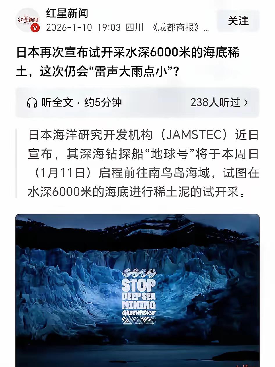 别再只盯着台海了!中国对日本的强硬反制,根本不是一时脾气,而是扫清统一障碍的“提前布局”,这步棋比想象中更狠。 谁能想到,日本为了跟中国硬刚,居然要去6000米深海挖稀土?要知道现在它六成稀土都得从中国进口,关键军工领域更是几乎全依赖,可就算这样,高市早苗还嘴硬不撤回涉台狂言。 这哪里是一时口误,分明是铁了心要武力介入台海的信号。这位日本首相公然说“台湾有事就是日本存亡危机”,还把防卫费提到GDP的2%,连续13年涨军费,又是买导弹又是搞远程打击能力,甚至想改规则卖武器,军国主义的苗头藏都藏不住了。 日本心里门儿清,稀土是军工制造的命脉,现在拼了命搞深海开采,就是想跟中国经济脱钩,为日后军事介入铺路。它以为抱上美国大腿,再砸11万亿日元扩军,就能在东亚横着走,可惜打错了算盘。 中国这次反应强烈,不是小题大做,而是看穿了日本的野心。解决台湾问题是必然,但不能带着后顾之忧,像日本这种主动跳出来的“绊脚石”,必须提前按住。 现在中方又是限制敏感物项出口,又是发起反倾销调查,国防部直接点名警告日方“再军事化”的危险,这都是精准打击。目的很明确:让日本知道,介入台海的代价它承受不起,提前打破它的军事幻想。 其实这就是统一前的“清场逻辑”:先把周边跳得最欢的势力打疼、打服,让它们明白干涉中国内政没有好下场。等真正解决台湾问题时,周边国家自然不敢再瞎蹦跶。 日本越是加速扩军、越是想搞供应链脱钩,越证明它心虚。毕竟深海采矿又费钱又难成功,投资回收得十几年,环保问题还一堆,纯属硬撑。 中国的底线从来不是摆设,统一大业更容不得半点干扰。提前收拾跳得最高的,就是为了让后续统一之路更顺畅,这才是大国谋略的高明之处。 你们觉得日本会真的放弃介入台海的想法吗?面对中国的精准反制,它还能硬撑多久?来评论区聊聊你的看法~