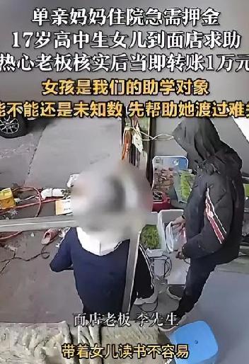 浙江17岁女生冲进面店借钱,老板二话不说转1万,真相看哭全网 浙江街头一家不起眼的面店,藏着最暖的人间烟火气。清晨的灶台还冒着热气,面店老板李先生正给顾客煮面,熟悉的17岁女生却红着眼站在门口,不是来买面,是低头扯着衣角开口借钱。 女生是附近高中生,单亲家庭长大,妈妈靠打零工供她上学。这天妈妈突然病倒住院,急需押金。她求遍亲戚,没人肯帮。走投无路时,她想起了常来的这家面店——李先生总怕她吃不饱,加量不加价,塞卤鸡蛋还不肯收钱。 李先生听完没犹豫,掏出手机直接转了10000元。女生愣住,她原本没敢奢望这么多。李先生却催她赶紧回医院,怕妈妈等急。转身又煮了两大碗面,卧上两个鸡蛋打包好塞给她,摆摆手说啥也不收钱。 这10000块,对一家小面店来说,是起早贪黑煮上千碗面才能攒下的辛苦钱。李先生明知女生还款没把握,却只想着“先帮她渡过难关”。他擦了擦眼角的湿意,转身又笑着招呼起下一位顾客。 网友看完集体破防,有人说“这老板想不发财都难”,有人感慨“善良是会循环的”。是啊,一碗面的温暖,一次毫不犹豫的援手,看似微不足道,却能撑起一个家庭的希望。 在这个容易焦虑的时代,我们总在说人情淡薄。可这家面店的故事告诉我们,善良从不是昂贵的东西,它藏在一碗热面里,藏在毫不犹豫的10000块里,藏在陌生人伸出的援手里。 你身边有没有这样温暖的小事?评论区分享一下吧!