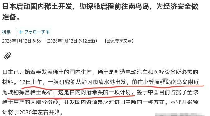 日本态度已明,不会指望中国,日本国内有动作了!1月12日,根据日经新闻报道,就在高市早苗公开表示中国的行为不可接受,管制行为只针对日本之后,日本国内已经有动作了。日媒称,12日上午,一艘日本研究船从静冈市清水港出发,前往小笠原群岛南鸟岛附近海域勘探含稀土泥矿。 高市早苗刚喊完“不接受”的口号,日本就急着派船出海,这波操作看着是硬气表态,实则更像被形势逼出来的仓促应对。简单说,就是中方针对日本的相关管制措施落地后,日本嘴上不认输,身体却已经在忙着找退路了,而南鸟岛的稀土泥矿勘探,就是他们眼下能拿出的最直接动作。 但这动作可不是临时起意的新方案,南鸟岛附近的稀土资源早在2012年就被日本发现了。当时日媒还曾大肆吹嘘,说这里的稀土储量超1600万吨,其中不少关键品类的储量能供全球用数百年,号称能让日本彻底摆脱资源进口依赖。可吹了十几年,直到2026年1月才真正派研究船出海勘探,原因再直白不过——这事儿根本没那么好干,之前一直停留在纸面阶段。 最核心的难题就是开采环境太恶劣。这些稀土泥矿埋在5600米深的海底,这个深度的水压相当于每平方厘米要承受600公斤的压力,海底温度只有2到4摄氏度,洋流还杂乱无章,普通的钻探设备连稳定取样都难,更别说批量开采了。 目前全球能应对深海作业的工程船,最大作业深度也才2500米,要在5500米到6000米的深海作业,必须专门研发建造专用设备。就拿勘探船来说,光设计研发就得耗好几年,后续测试调试又是一大笔时间和资金投入,日租金就要1300万日元的现有深海工程船都用不上,更别说开采设备了。 就算能解决开采设备的问题,后续还有一堆麻烦等着。首先得过国际海底管理局的审批,还要完成严格的环境影响评估,现在全球对深海矿业的态度都很谨慎,不少国家已经明确禁止商业性深海开采,日本想推进这事儿,光审批流程就得耗上不短的时间。而且环保团体已经开始发声抗议,认为深海开采会破坏海底生态系统,后续的舆论压力和环保阻力都不小。 退一万步来说,就算一切顺利,这事儿也急不来。日本目前的目标只是小规模试采,计划每天开采350吨,要建成配套的处理厂实现商业化运营,最早也得等到2027年。而要真正实现规模化开采,形成稳定的供应能力,业内普遍认为至少还需要十年时间。 这十年里,日本所谓的“不指望中国”,根本就是句没法落地的空话,眼下的资源缺口根本没法通过这个方案填补。 或许有人会觉得,日本可以找其他国家采购替代资源。但事实上,日本之前也试过找澳大利亚、越南等国搭建替代供应链,结果发现全是徒劳。这些国家的稀土资源要么开采成本高得离谱,要么加工技术跟不上,就连越南的稀土原料,本质上还是依赖中国的上下游供应链,所谓的“替代”不过是绕了个弯子,根本解决不了核心的供应问题。 高市早苗之前还放话要联合G7应对,可西方各国在稀土加工提纯等关键环节的技术积累,和中国差着不小的差距,之前好几次想联合重建供应链都没成功,现在抱团也解决不了实际问题。 说到底,日本这波操作就是典型的骑虎难下。自己先挑事引发中方反制,嘴上硬撑着“不指望中国”,实则只能拿出一个十几年前就有的、短期根本没法落地的勘探方案来撑场面。南鸟岛的稀土勘探看似是条出路,实则布满了技术、审批、环保等各种难关,短期内根本解不了燃眉之急。 与其花心思在这种不切实际的方案上摆姿态,不如好好琢磨琢磨怎么摆正自己的位置,尊重基本的国际规则和他国核心利益。毕竟,嘴硬解决不了实际问题,真要摆脱眼下的困境,靠的是务实的态度,而不是自欺欺人的表态。