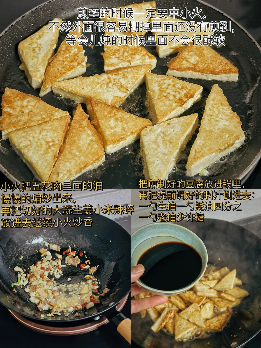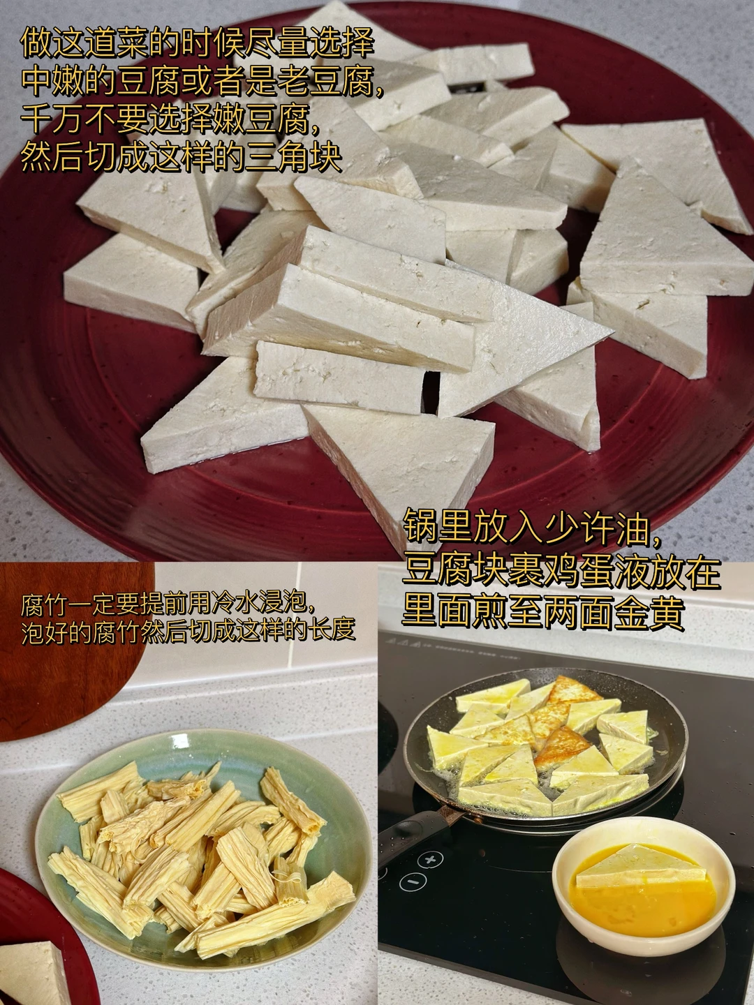 1. 做这道菜的时候尽量选择中嫩的豆腐或者是老豆腐,千万不要选择嫩豆腐,然后切成这样的三角块 2. 腐竹一定要提前用冷水浸泡,泡好的腐竹然后切成这样的长度 3. 锅里放入少许油,豆腐块裹鸡蛋液放在里面煎至两面金黄 4. 煎至的时候一定要中小火,不然外面很容易糊掉里面还没有煎到,等会儿炖的时候里面不会很酥软 5. 小火把五花肉里面的油慢慢的煸炒出来,再把切好的大蒜生姜小米辣碎放进去继续小火炒香 6. 把煎制好的豆腐放进锅里,再把提前调好的料汁倒进去:一勺生抽一勺蚝油四分之一勺老抽少许糖 7. 出锅前加入适量盐鸡粉调味还可以放一些葱花段,我放了一点青椒进去 8. 煎制过的豆腐这样中小火慢慢炖出来里面很入味,又超级的酥软超级好吃