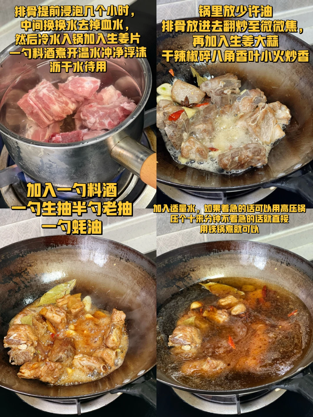 1. 排骨提前浸泡几个小时,中间换换水去掉血水,然后冷水入锅加入生姜片一勺料酒煮开温水冲净浮沫沥干水待用