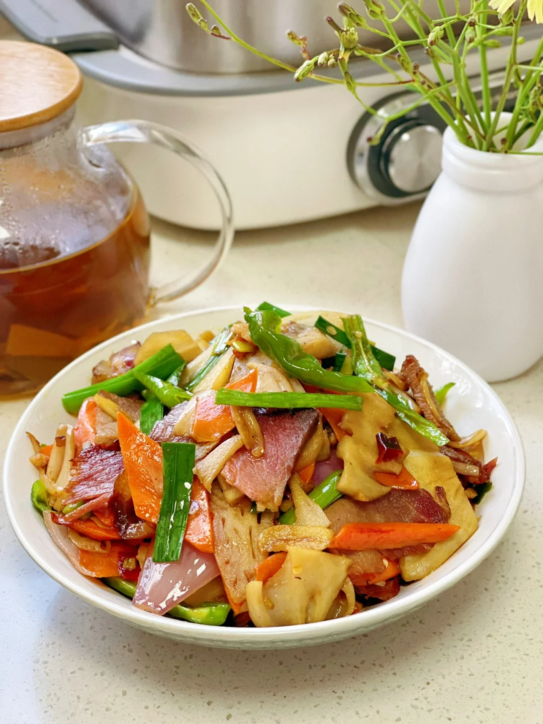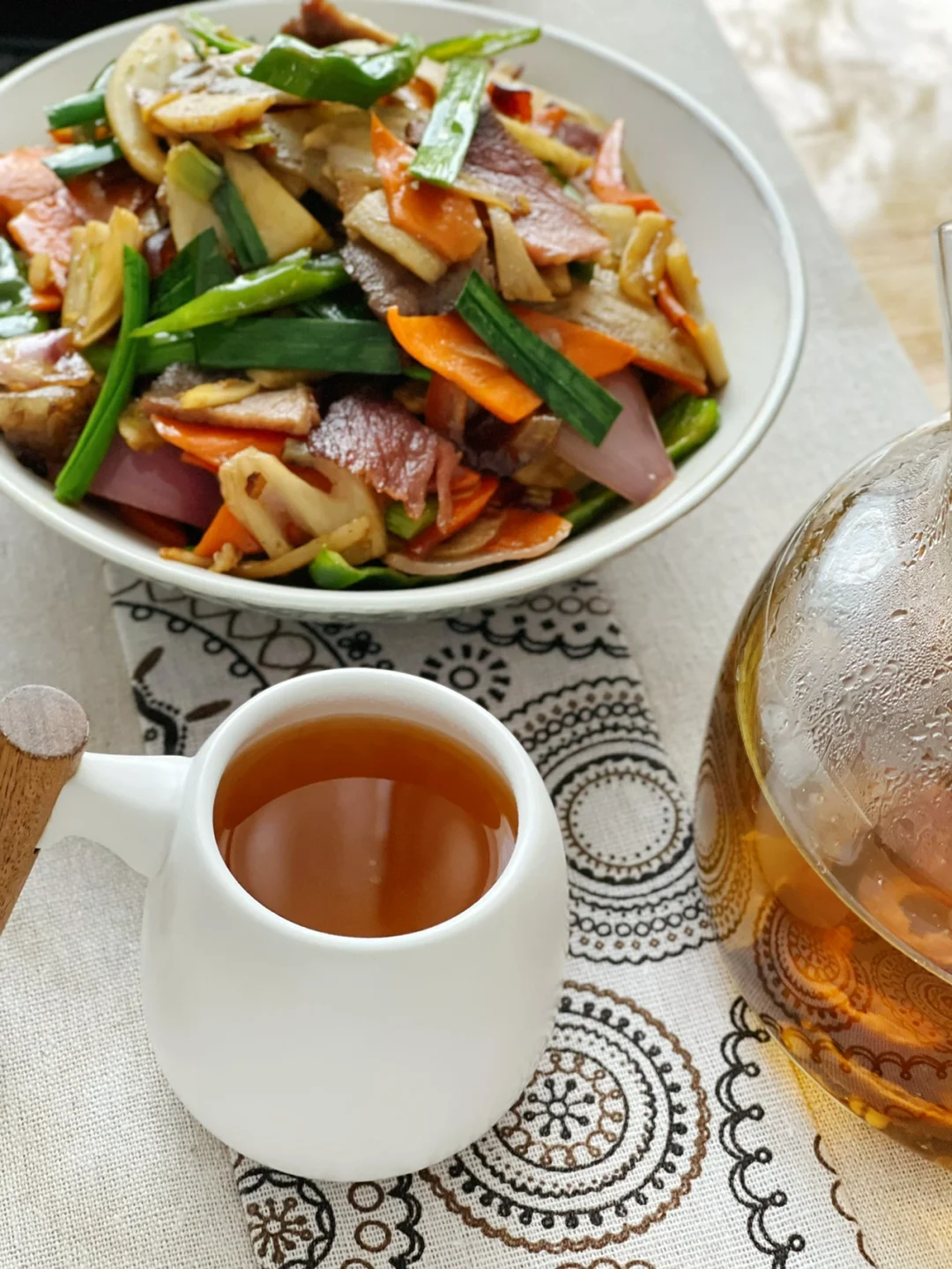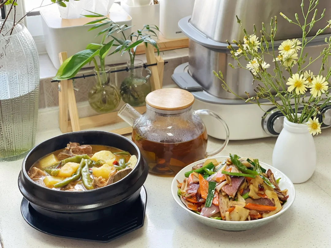 今日午餐收拾冰箱库存,前几天妈妈做的腊肉炒蘑菇一下子又馋腊肉了,所以今天做了腊肉炒胡萝卜🥕藕片,果然胡萝卜吃油特别是肉油,我把腊肉肥的部分油全部小火煸炒出来了做完果然好吃😋!冰箱里的四季豆再不吃就太老了,所以和排骨土豆一起炖了,在泡上一壶茶虽然只有两个菜但是吃的很满足呀