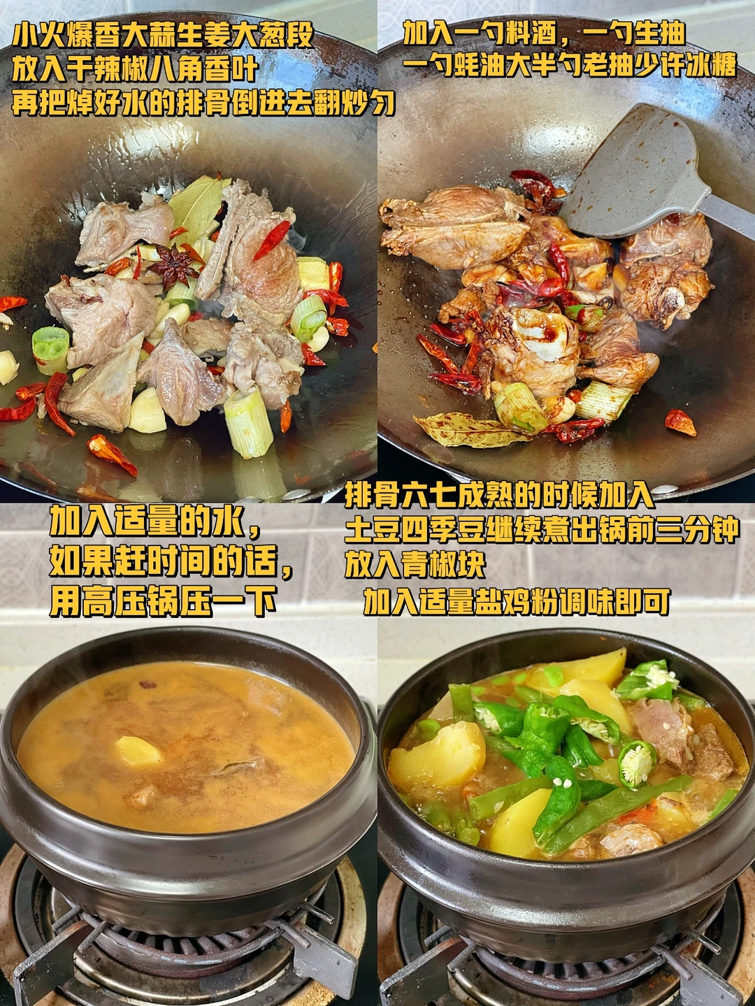 1. 小火爆香大蒜生姜大葱段放入干辣椒八角香叶再把焯好水的排骨倒进去翻炒匀