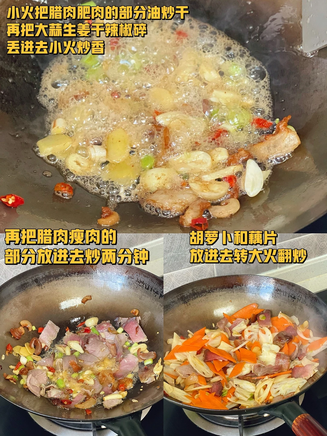 1. 小火把腊肉肥肉的部分油炒干再把大蒜生姜干辣椒碎丢进去小火炒香