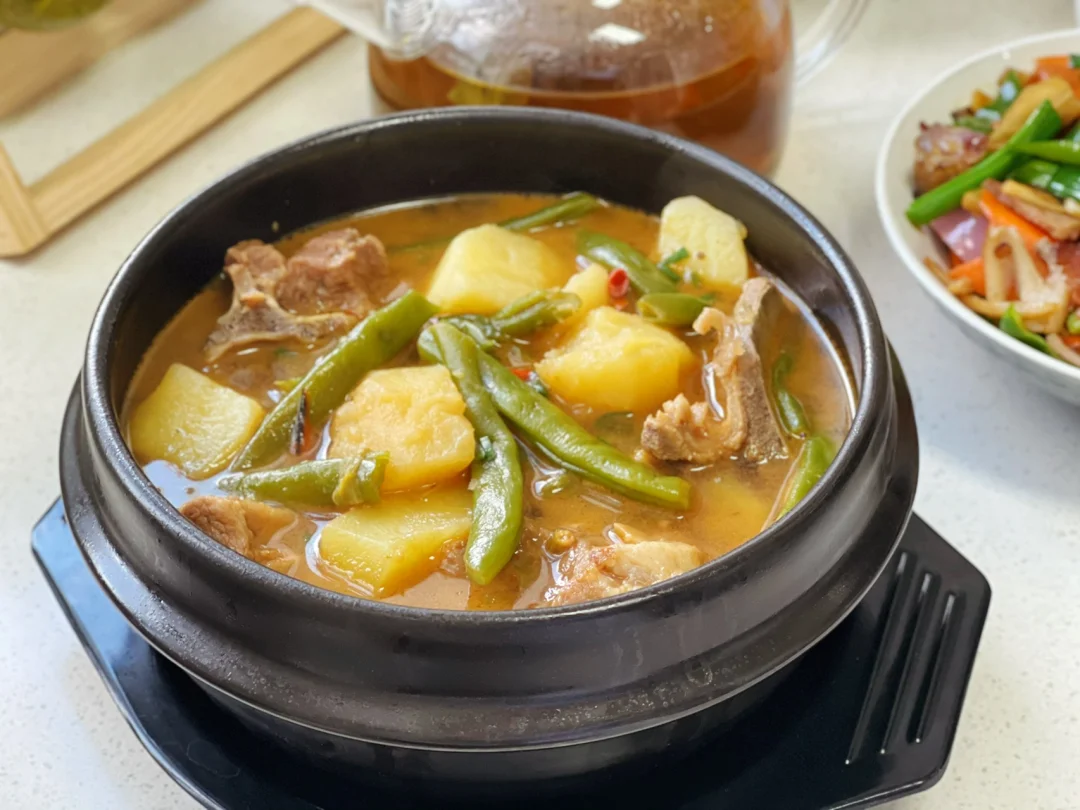4. 排骨六七成熟的时候加入土豆四季豆继续煮出锅前三分钟放入青椒块