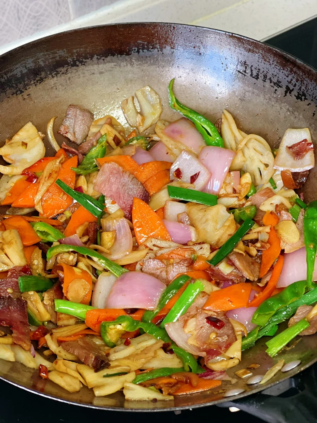 4. 胡萝卜和藕片快好的时候最后把洋葱放进去翻炒一分钟左右,加入适量盐鸡粉一勺生抽出锅前撒蒜苗段葱段都可以