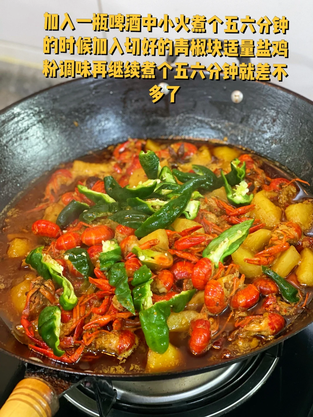 8. 加入一瓶啤酒中小火煮个五六分钟的时候加入切好的青椒块适量盐鸡粉调味再继续煮个五六分钟就差不多了
