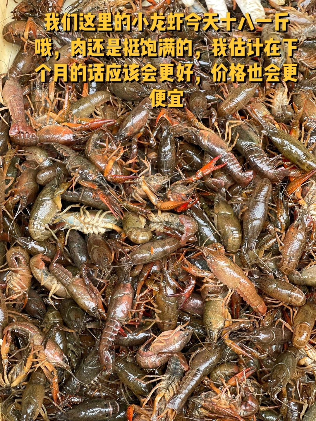 1. 我们这里的小龙虾今天十八一斤哦,肉还是挺饱满的,我估计在下个月的话应该会更好,价格也会更便宜