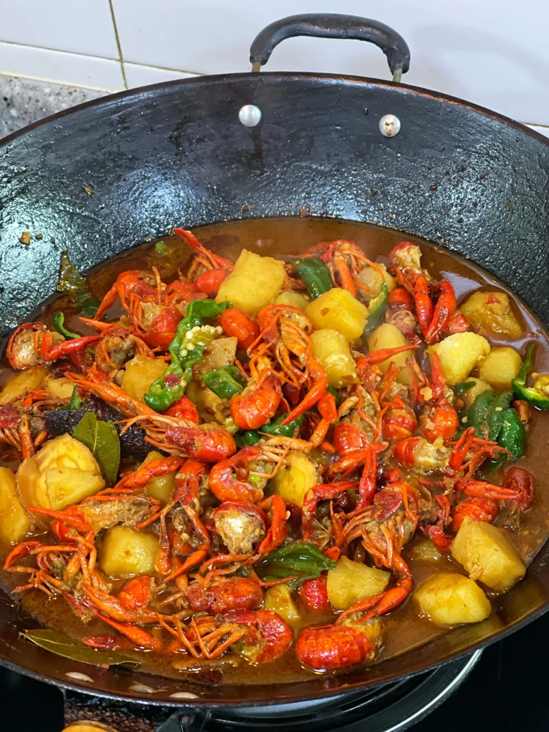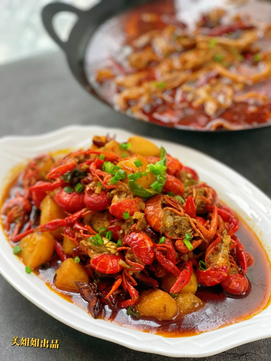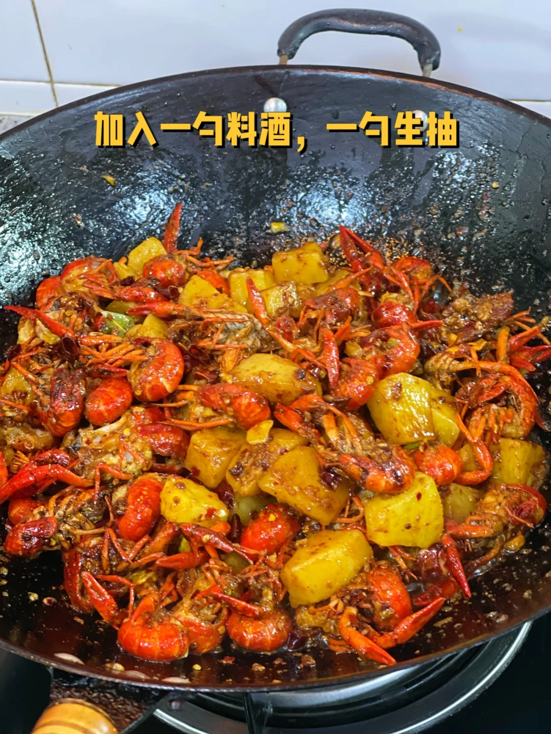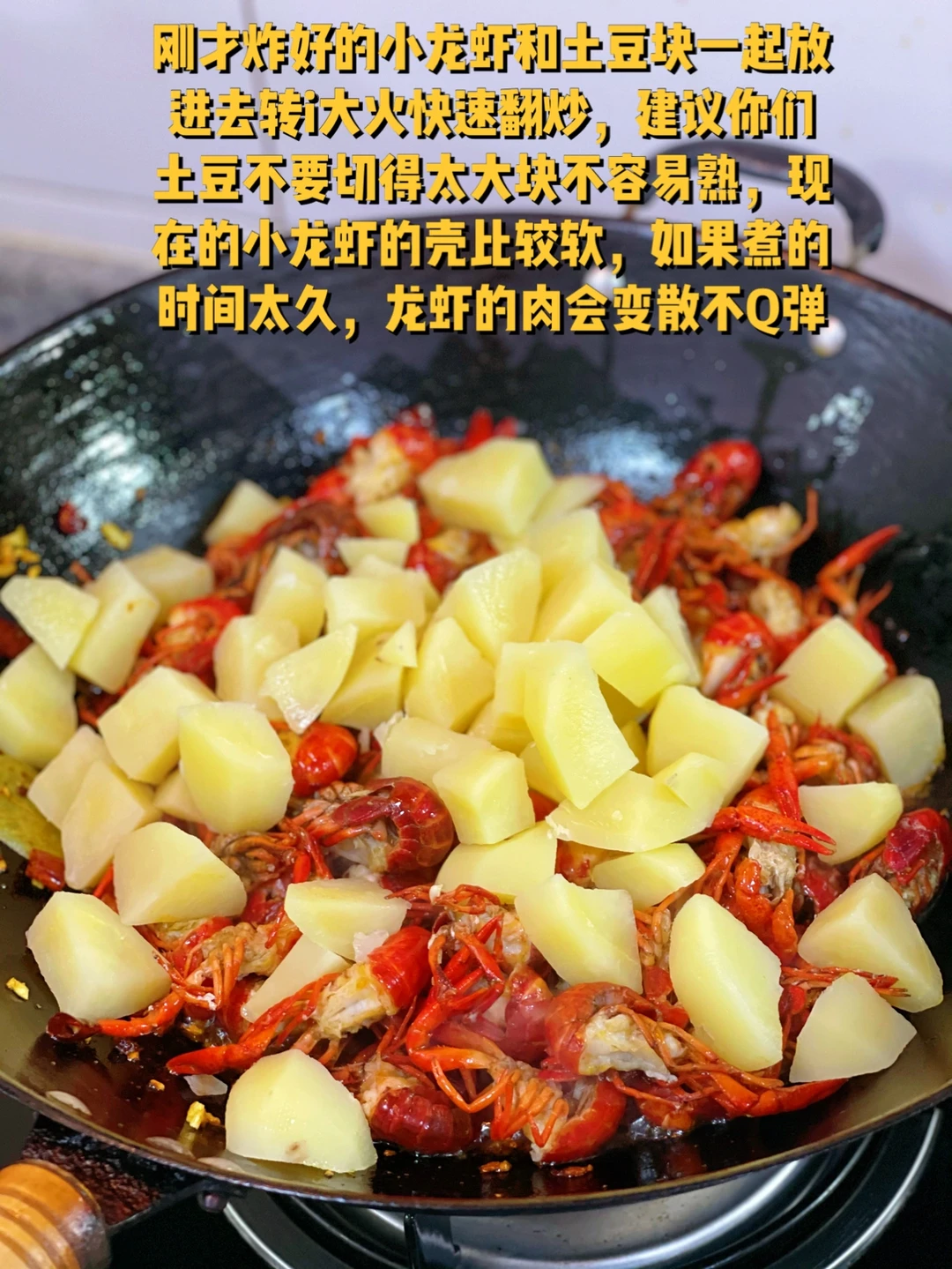 6. 刚才炸好的小龙虾和土豆块一起放进去转大火快速翻炒,建议你们土豆不要切得太大块不容易熟,现在的小龙虾的壳比较软,如果煮的时间太久,龙虾的肉会变散不Q弹