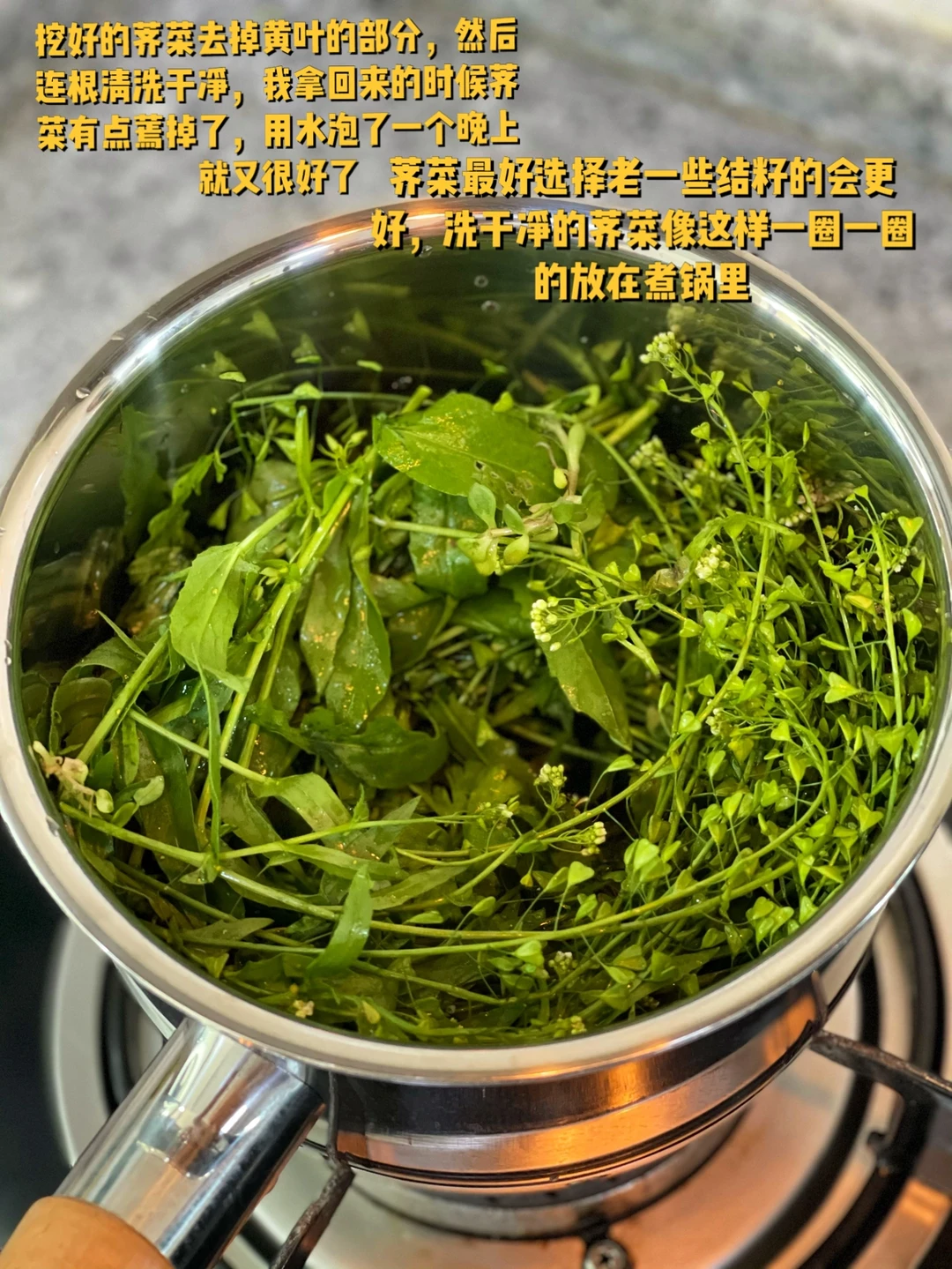 1. 挖好的荠菜去掉黄叶的部分,然后连根清洗干净,我拿回来的时候荠菜有点蔫掉了,用水泡了一个晚上就又很好了,荠菜最好选择老一些结籽的会更好