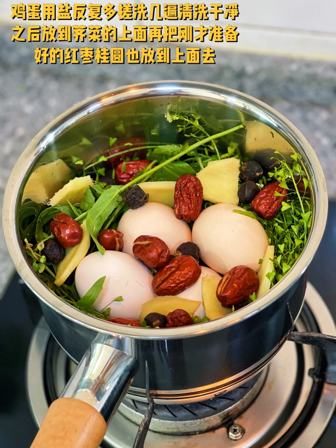 3. 鸡蛋用盐反复多搓洗几遍清洗干净之后放到荠菜的上面再把刚才准备好的红枣桂圆也放到上面去