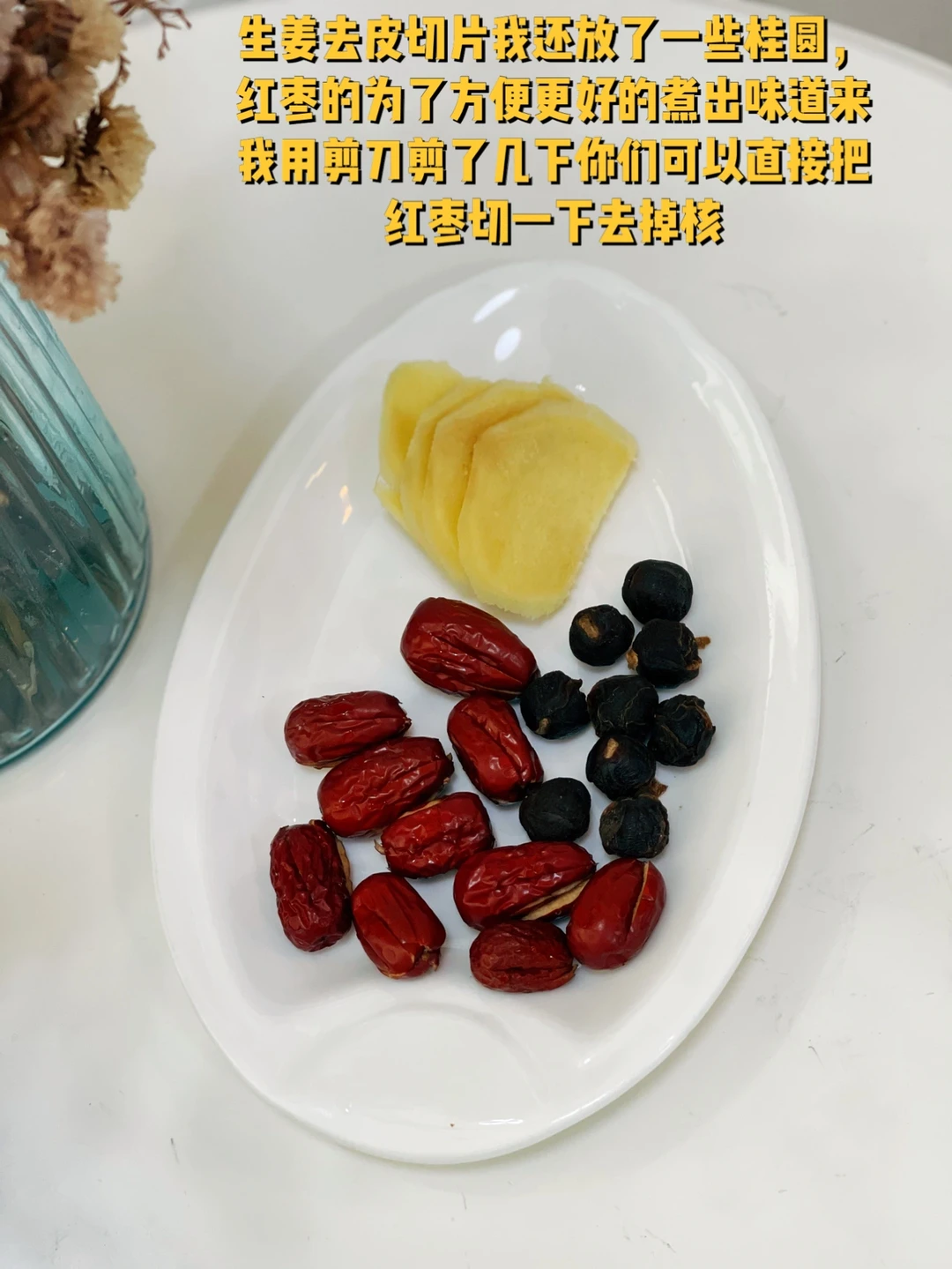 2. 生姜去皮切片我还放了一些桂圆,红枣的为了方便更好的煮出味道来我用剪刀剪了几下你们可以直接把红枣切一下去掉核