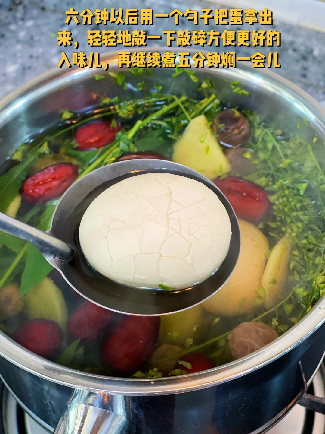 5. 六分钟以后用一个勺子把蛋拿出来,轻轻地敲一下敲碎方便更好的入味儿,再继续煮五分钟闷20分钟