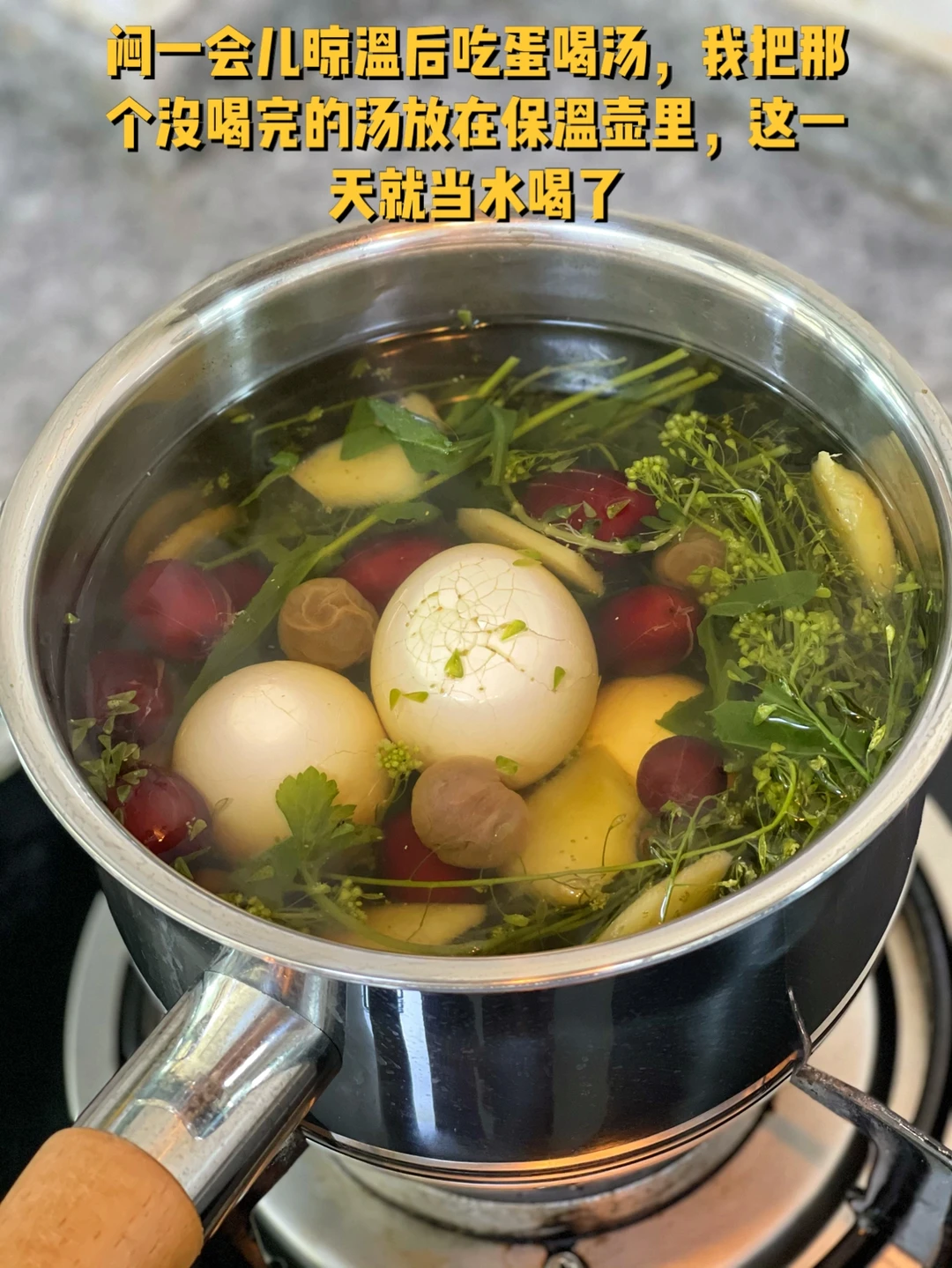 6. 闷一会儿晾温后吃蛋喝汤,我把那个没喝完的汤放在保温壶里,这一天就当水喝了