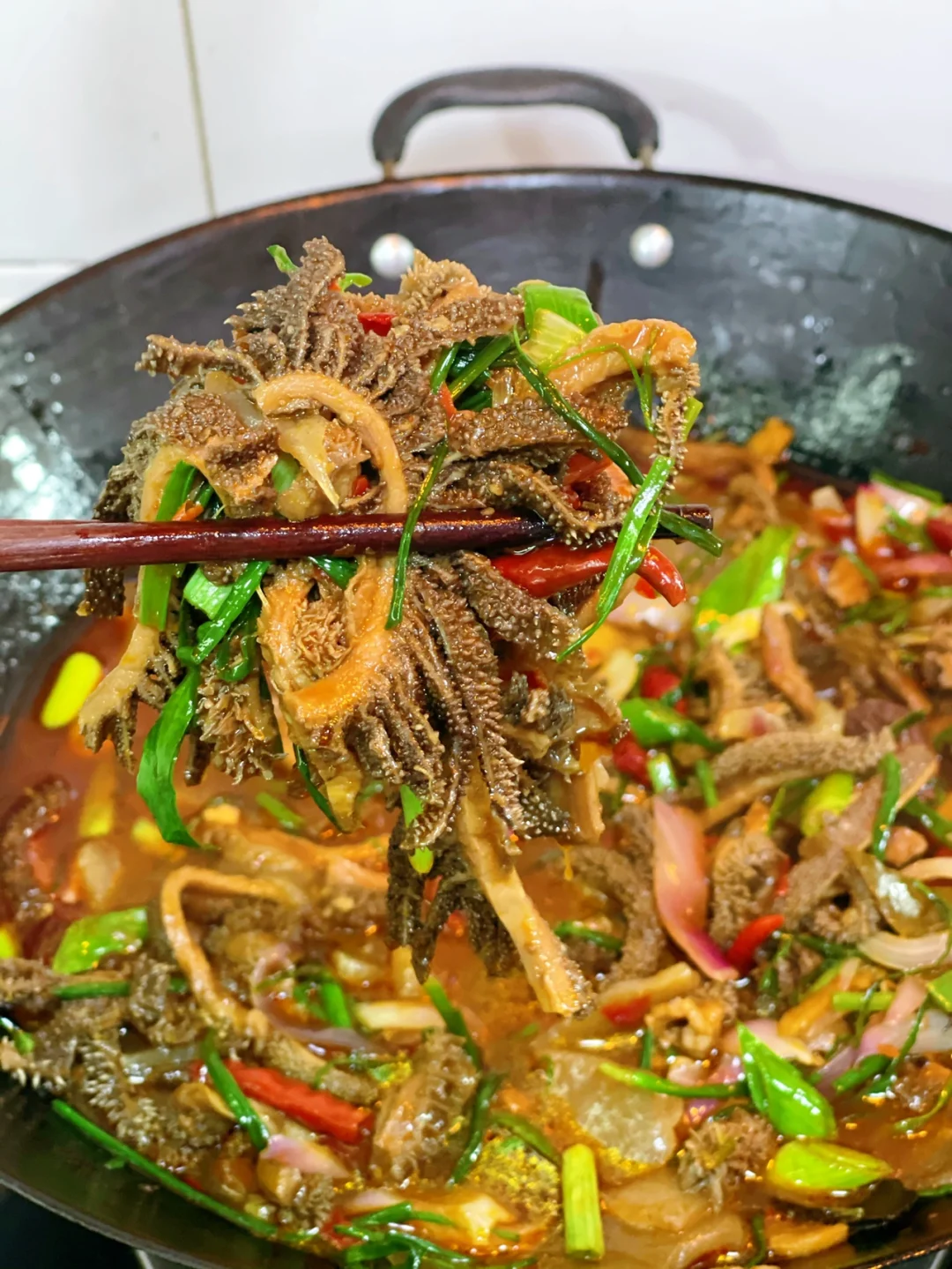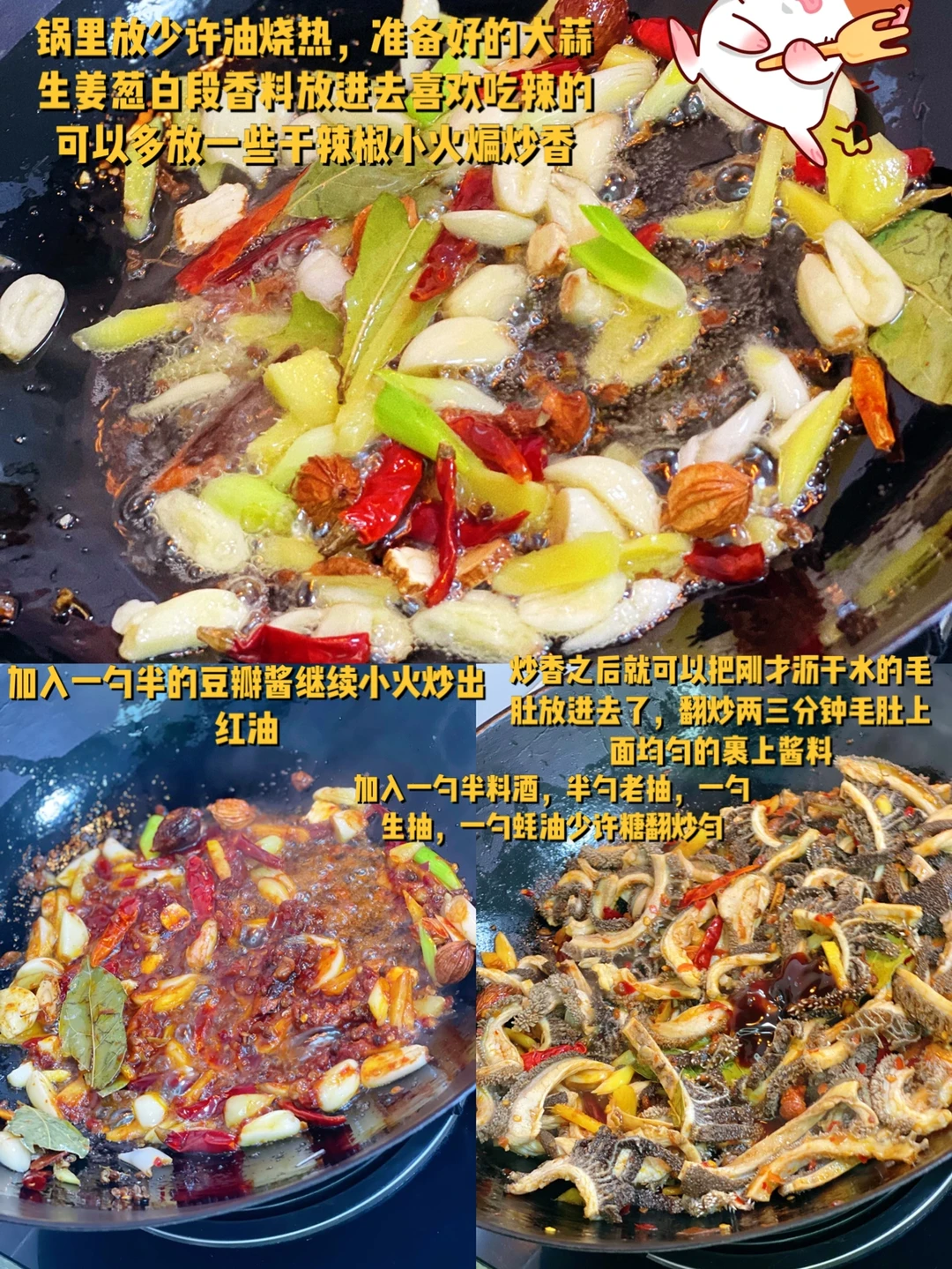 8. 炒香之后就可以把刚才沥干水的毛肚放进去了,翻炒两三分钟毛肚上面均匀的裹上酱料
