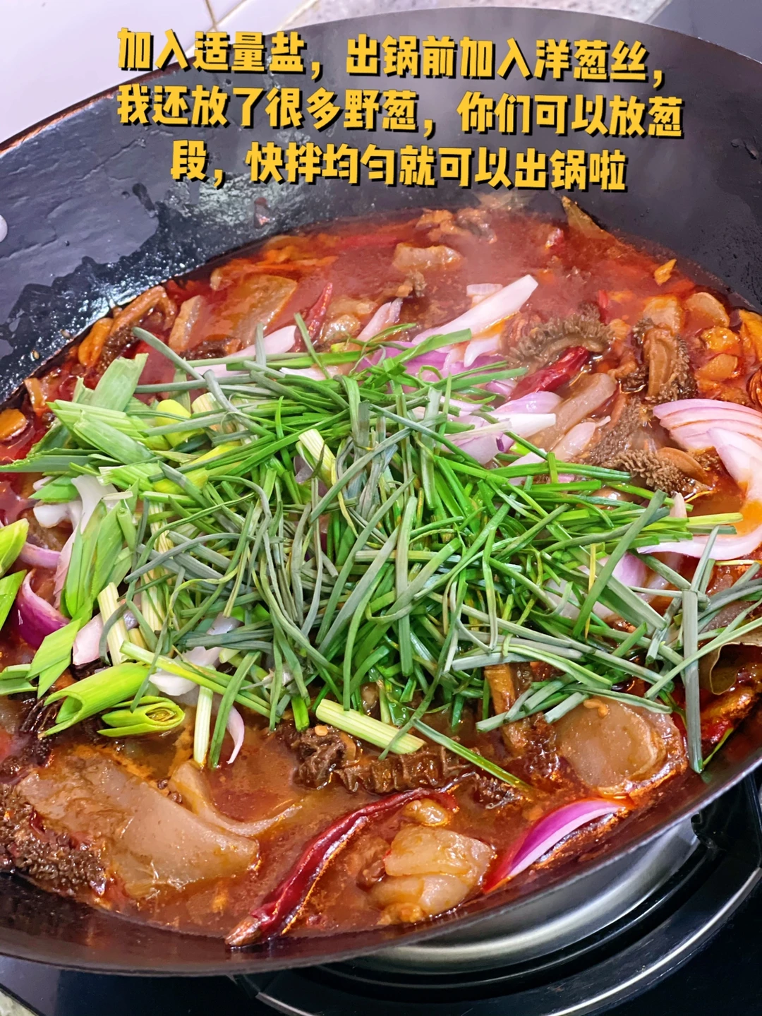 12. 加入适量盐,出锅前加入洋葱丝,我还放了很多野葱,你们可以放葱段,快拌均匀就可以出锅啦