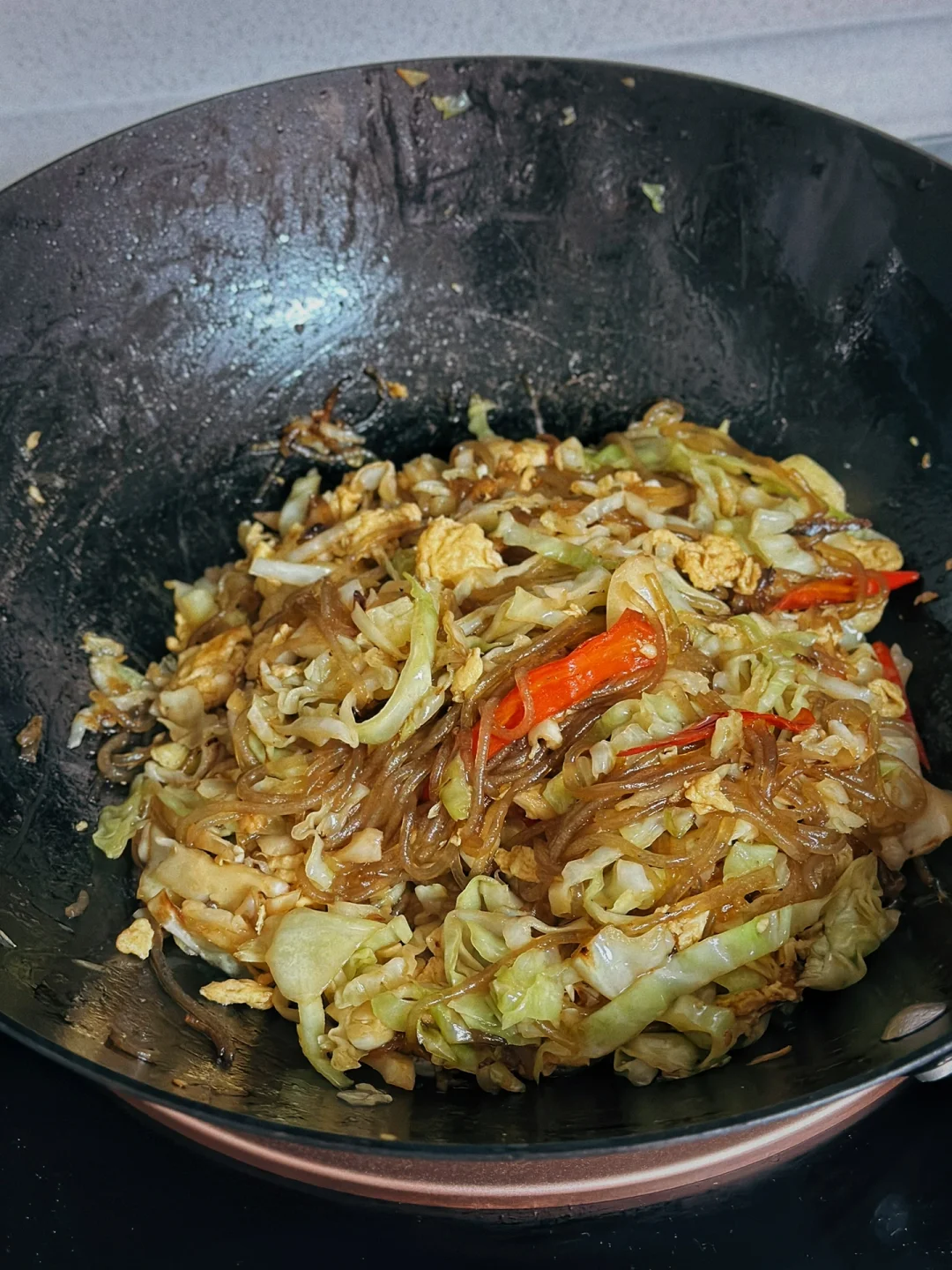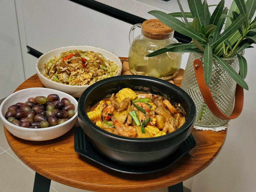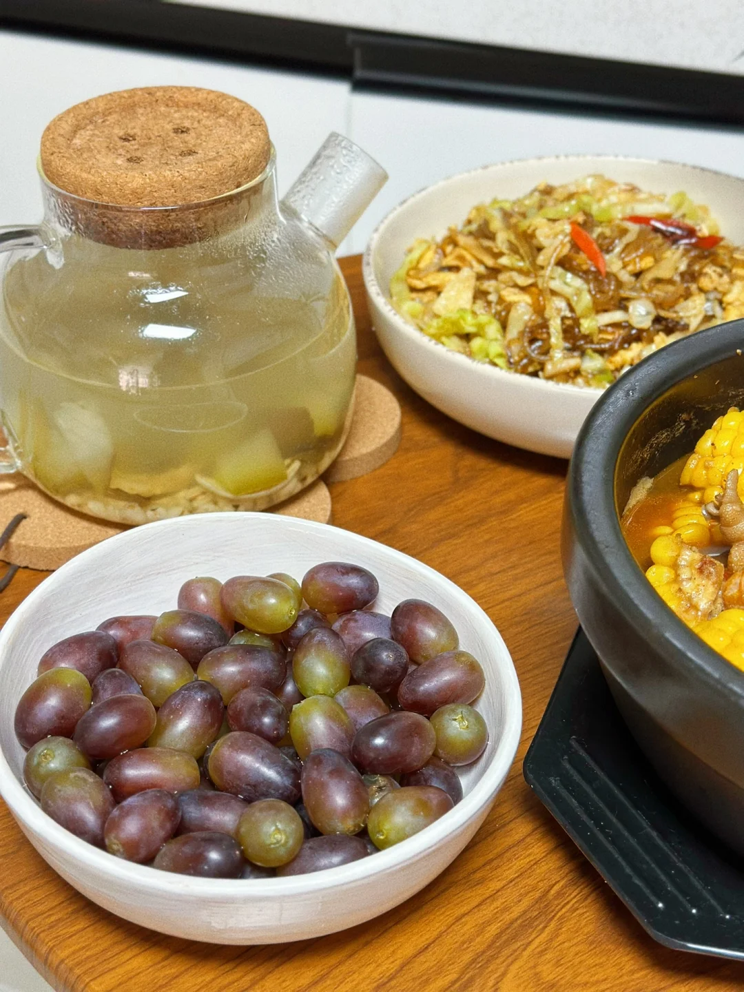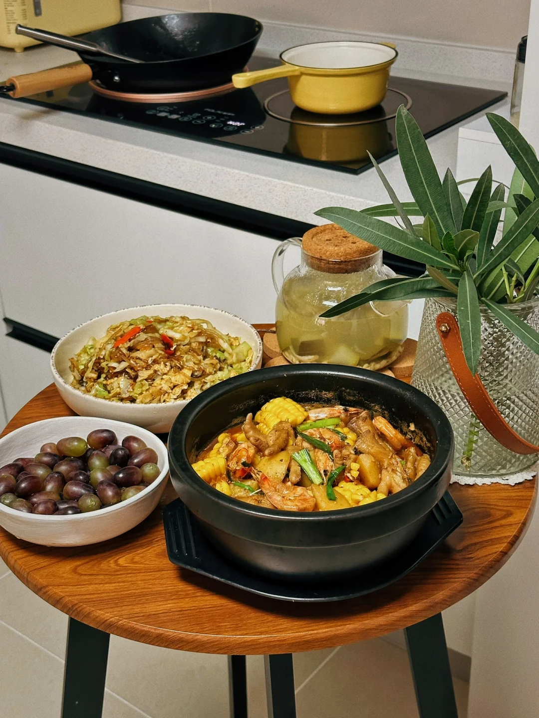 今日晚餐鸡爪虾煲/包菜烧粉条/冬瓜薏米茶