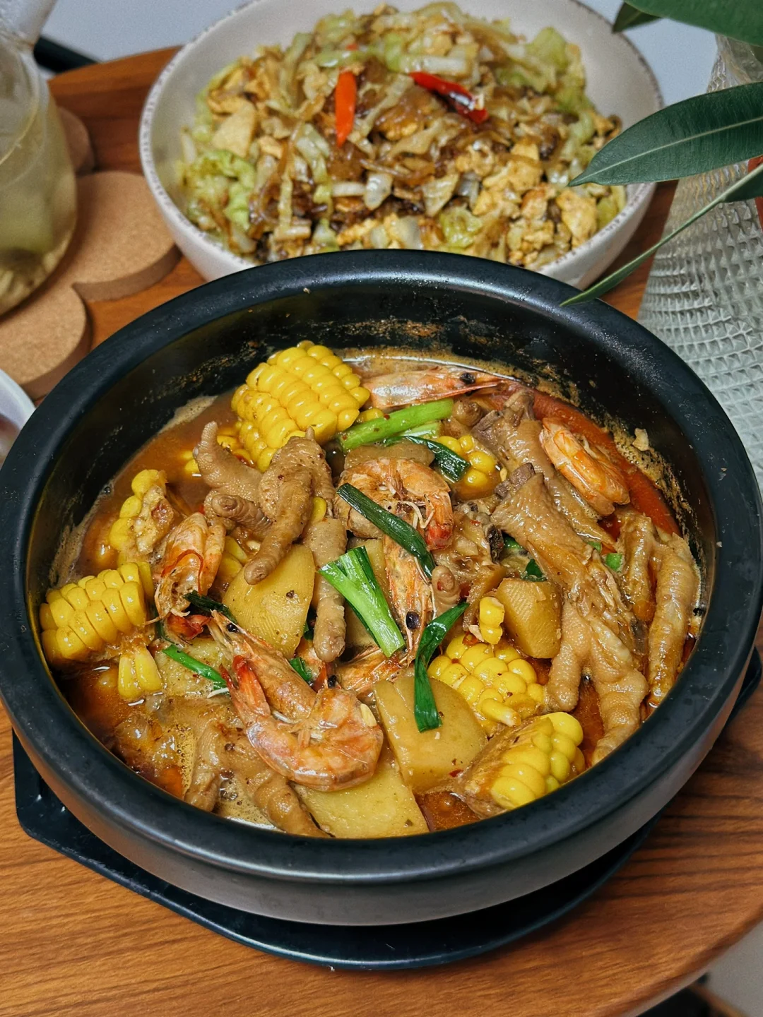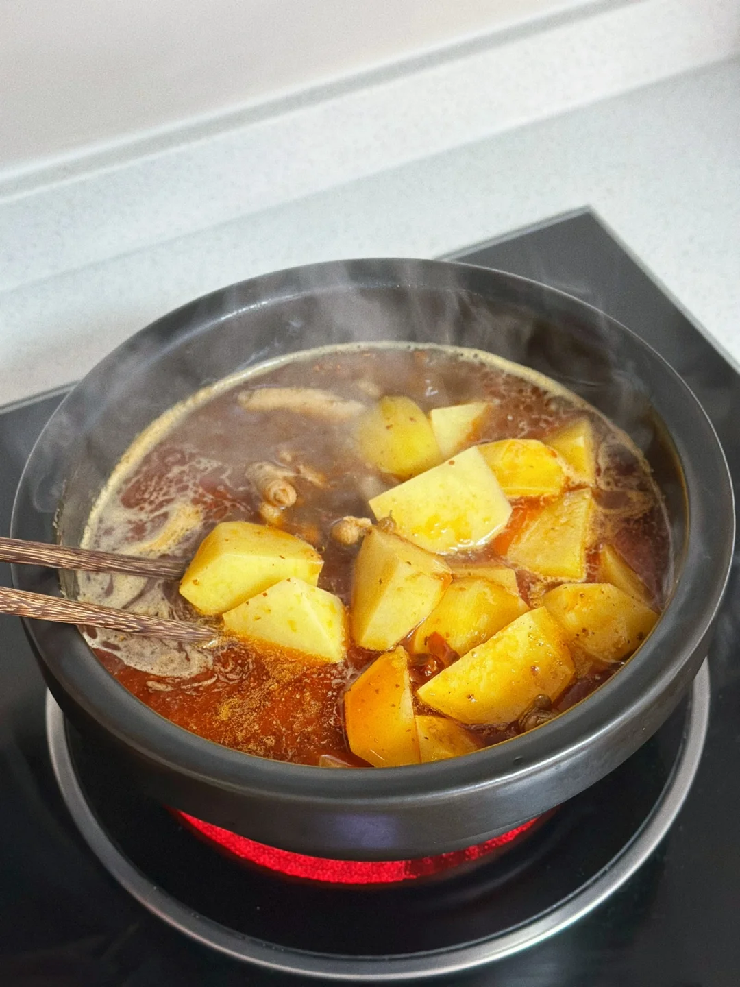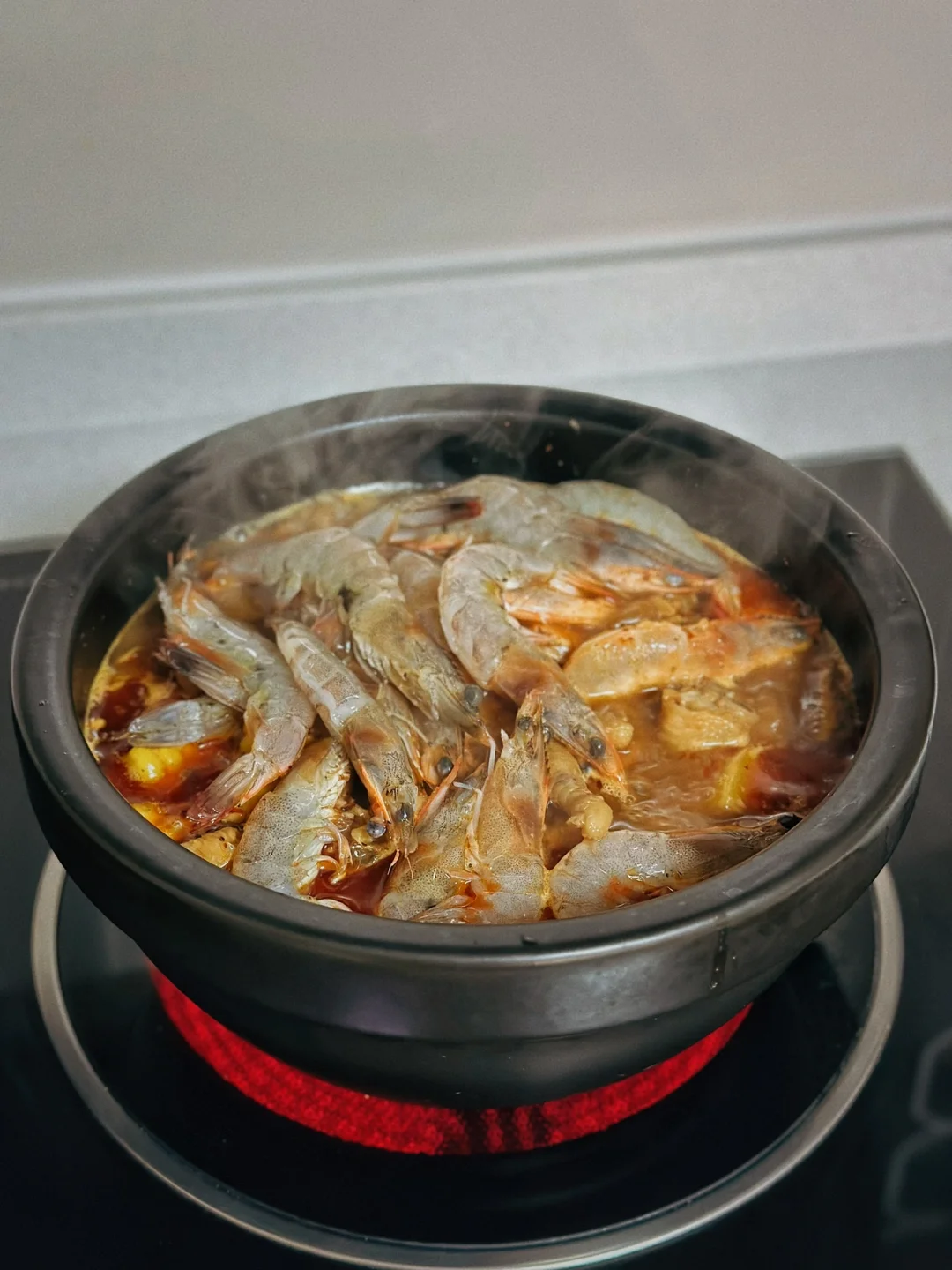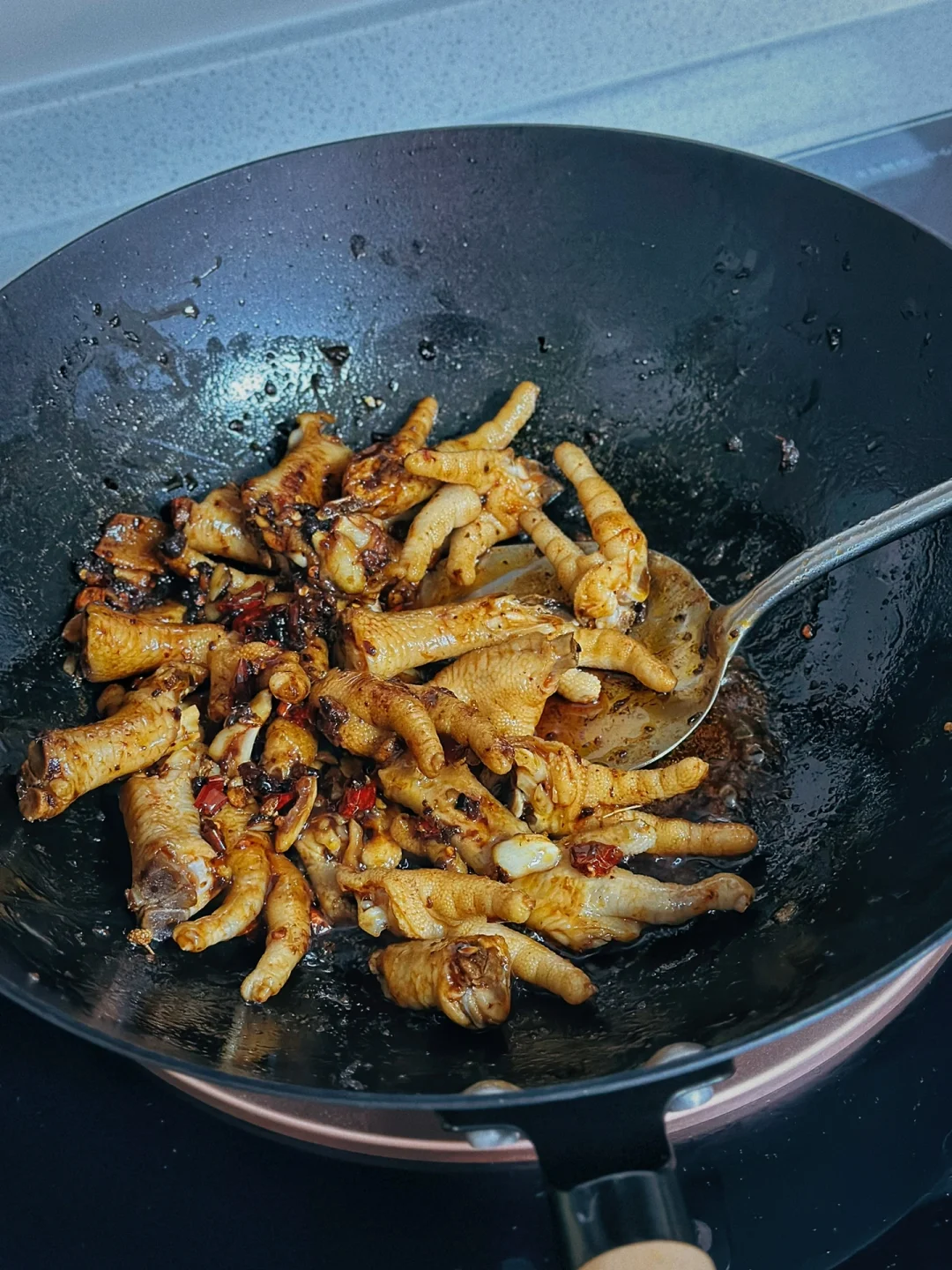 早上起来的时候看到别人烧的鸡爪虾煲给我馋坏了,起来打扫好卫生在网上买了鸡爪,中午就给做起来了,还别说最近的鸡爪挺贵的,400克左右二十大洋,家里有虾,土豆玉米刚好一锅炖太惬意了,主要是这两天的苏州哪里人都多出去不光堵车,景区是看人的后脑勺还不如在家做一点自己喜欢吃的,找一个喜欢看的电影慢悠悠来的自在 1.鸡爪对半切开,冷水入锅葱结姜片丢进去,-大勺料酒煮开,捞起来温水冲净浮沫沥干水待用 虾从背部剪开,去掉虾线,-勺料酒腌制一 下 2.两勺豆瓣酱,两勺生抽两勺老抽,-勺蚝油,半勺胡椒粉搅匀待用,腌制好的虾平底锅炉煎炒熟 3.小火爆香大蒜生姜干辣椒,八角桂皮草果豆蔻香叶花椒,还丢了几颗冰糖进去,小火慢慢炒香 4.鸡爪,鸡翅,土豆块儿胡萝卜块儿,牛肉丸葱结丢进去快速翻炒 5.一大勺料酒,然后刚才调好的料汁儿也全部丢进去 6.加入适量水,大火煮开以后转中小火慢慢煮,水不需要太多哦,我这个都有点多了 7.三分之-汤汁的时候先前煎炒好的虾丢进去翻炒匀煮两分钟少许盐鸡粉调味,来瓶冰啤酒,找一个喜欢的剧不要太惬意了哦