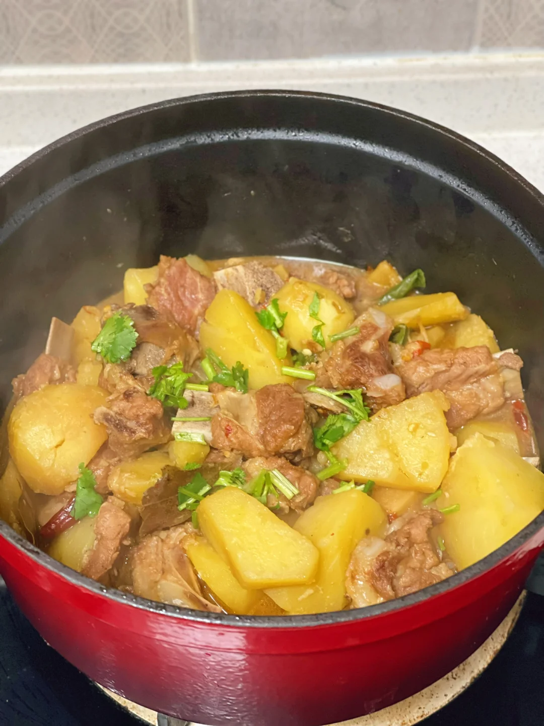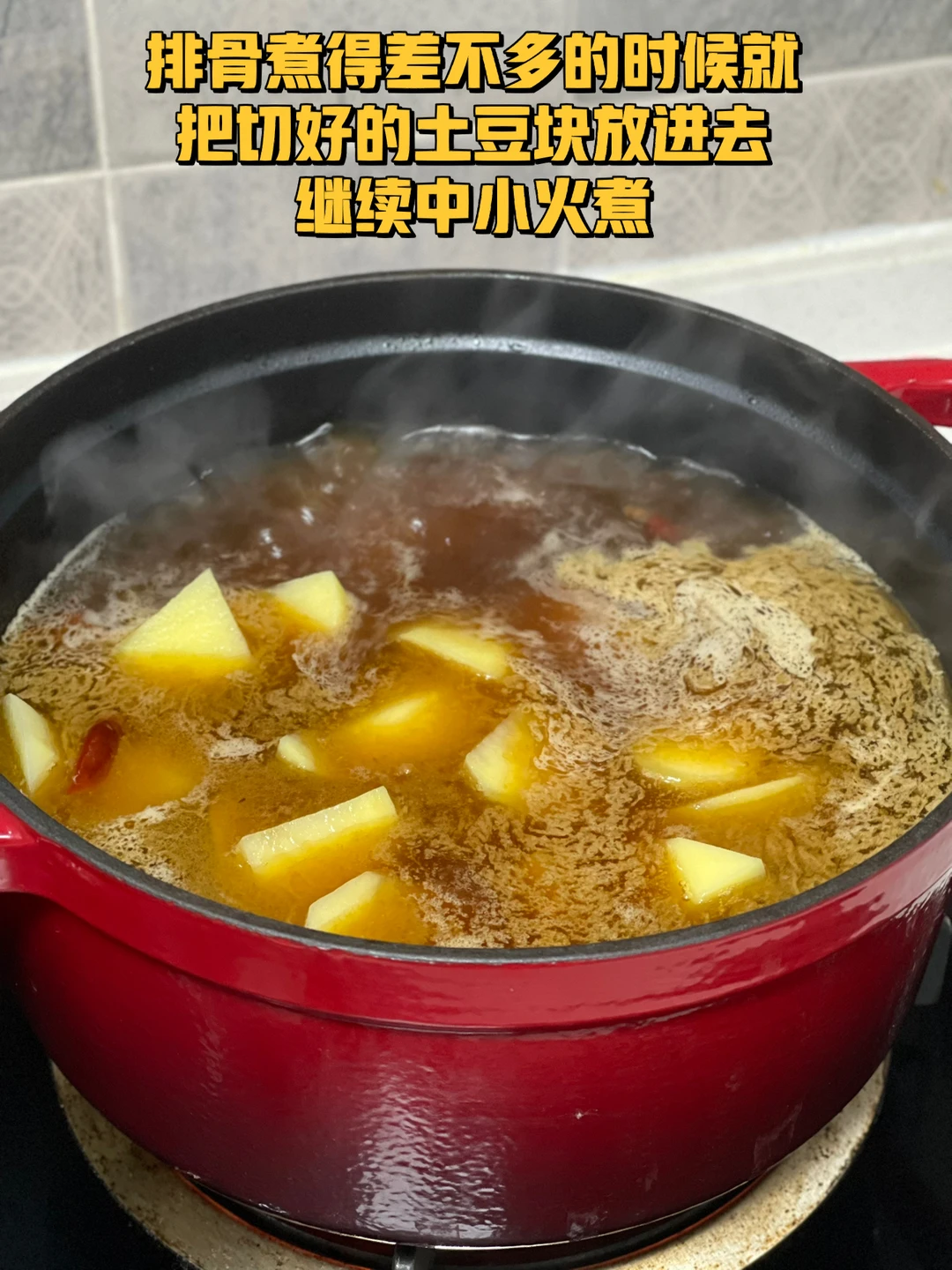 5.排骨煮得差不多的时候就把切好的土豆块放进去继续中小火煮