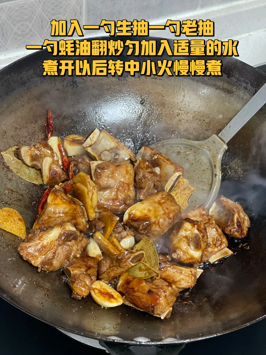4.加入两勺生抽一勺老抽一勺蚝油翻炒匀加入适量的水煮开以后转中小火慢慢煮(着急的话高压锅压十来分钟)