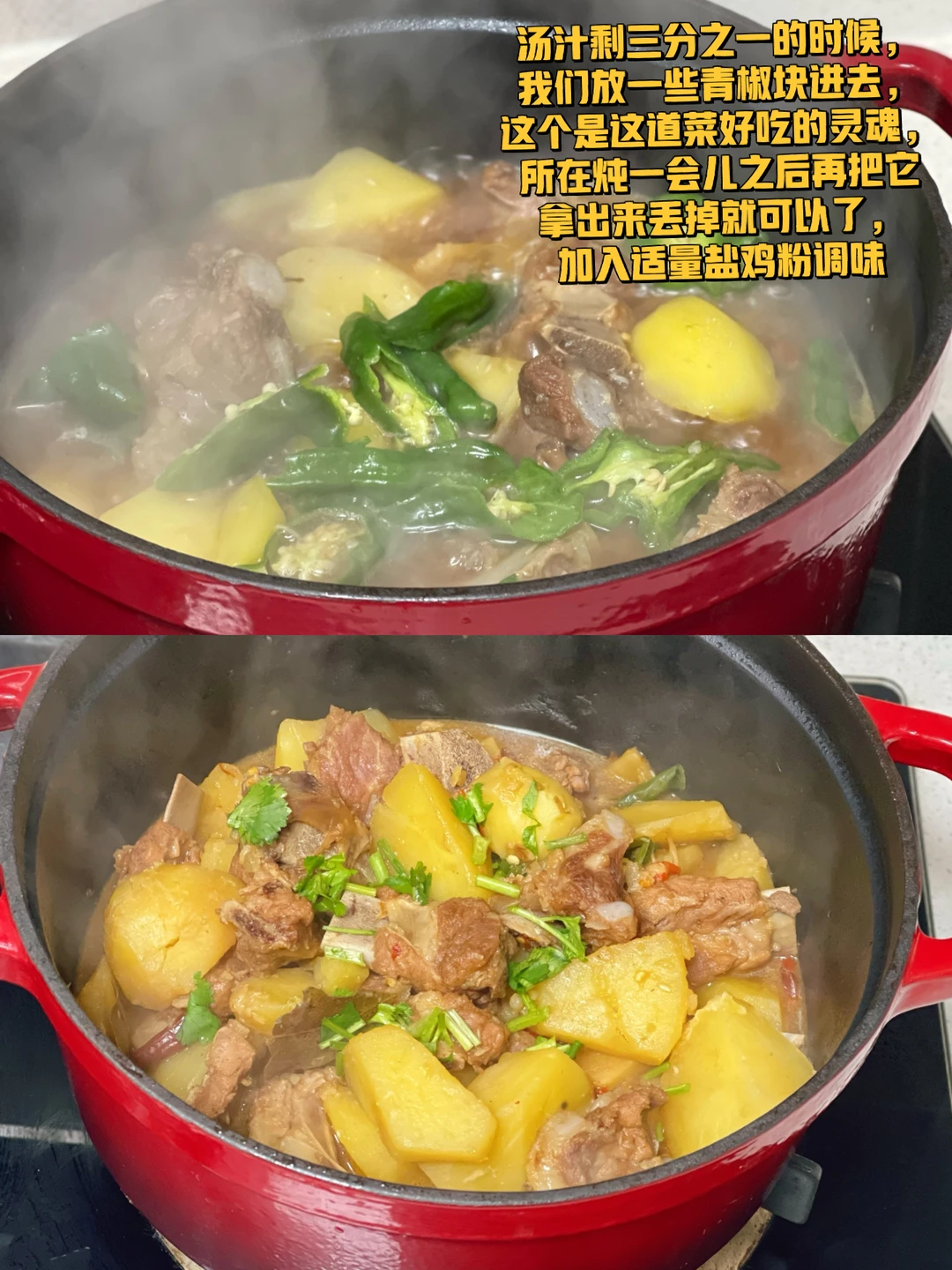 6.汤汁剩三分之一的时候,我们放一些青椒块进去,这个是这道菜好吃的灵魂所在,炖一会儿之后再把它拿出来丢掉就可以了,加入适量盐鸡粉调味