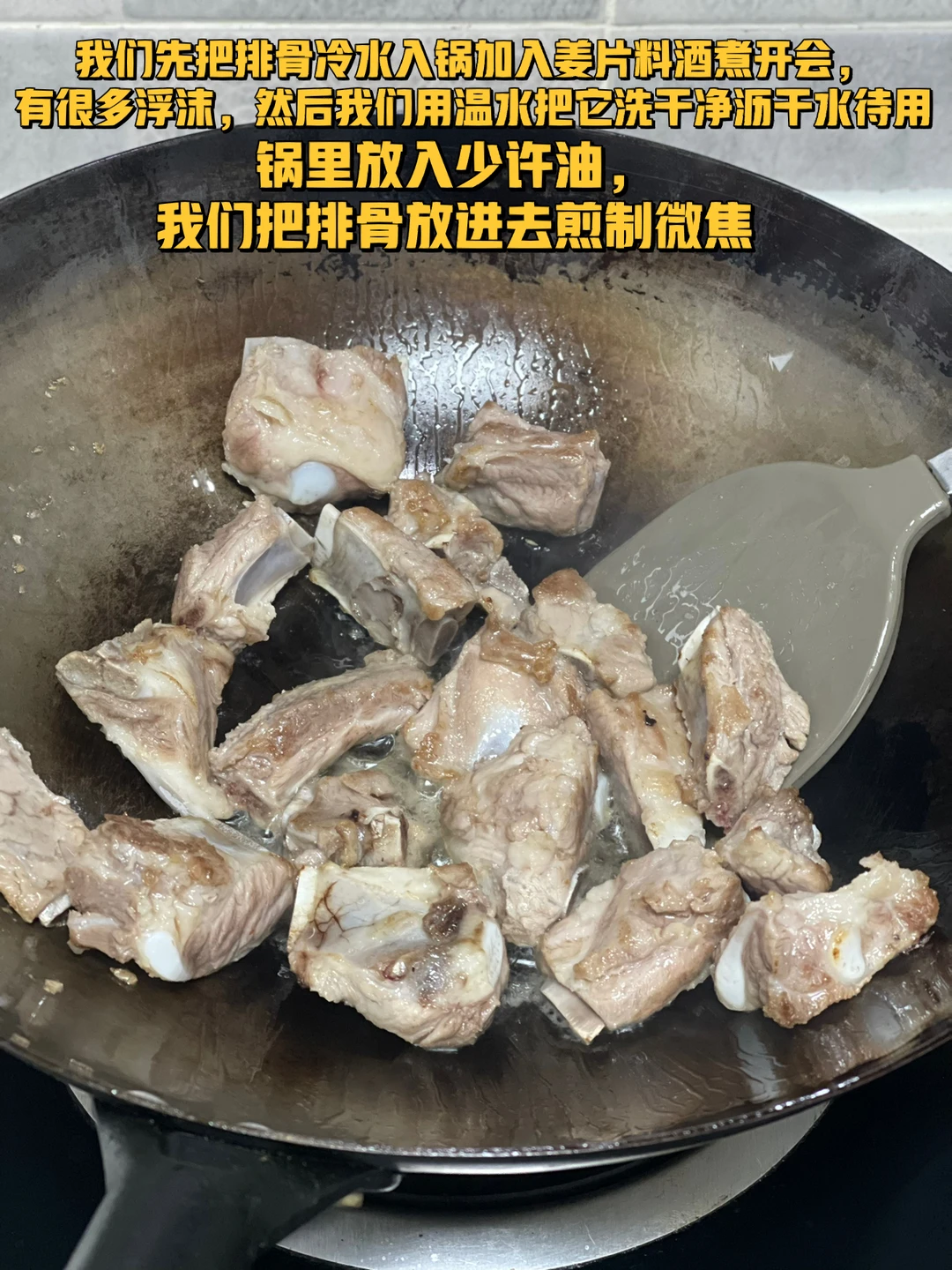 2.锅里放入少许油,我们把排骨放进去煎至微焦