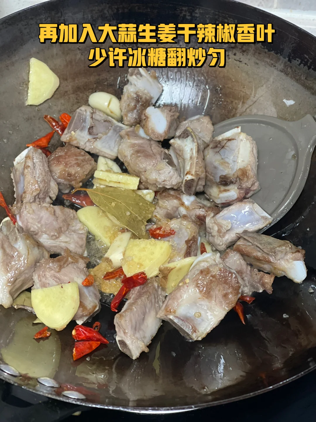 3.再加入大蒜生姜干辣椒香叶少许冰糖翻炒匀