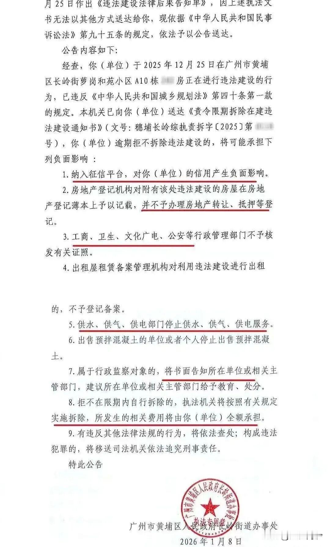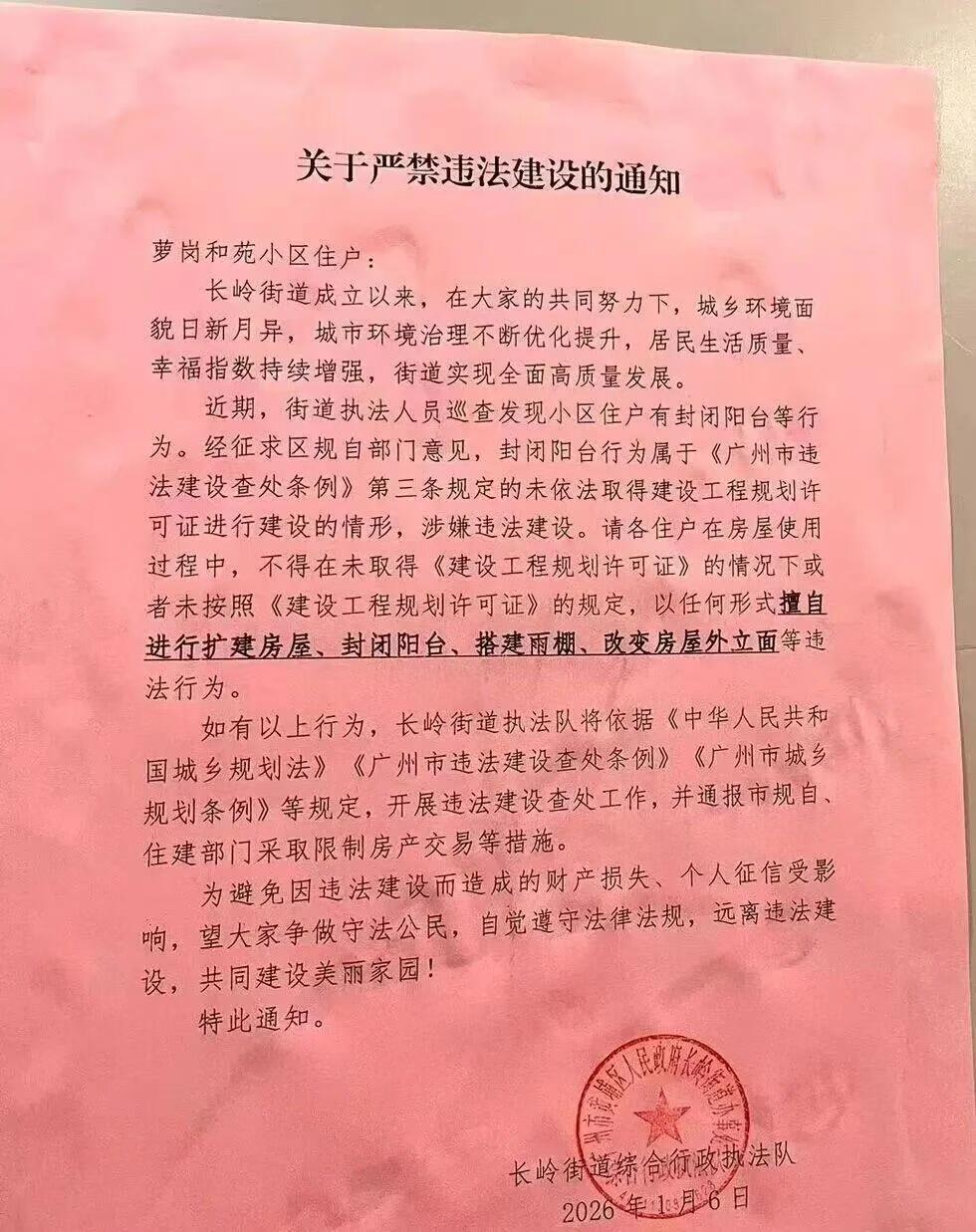 【黄埔继续硬刚违规封阳台!】黄埔近期大力打击辖区内违建问题,尤其是违规封阳台的行为。早前多个楼盘都收到了限期拆除的通知书,现在又来新的整活。而2026年刚开始黄埔区官网就发布了多起违建告知单和责令拆除通知书。 光是1月8号就一口气发了18份,“点名”萝岗和苑A9-A10、E1-E2栋的9户业主。责令拆除通知书重点明确四点:1.责令立即停止;2.限期自行拆除;3.不自行拆除或被依法强拆;4.可以提出陈述、申辩意见。 而根据粉丝爆料,该小区已经有人接到了《违法建设法律后果告知单》,重点提及九条:比如,可能会影响征信、限制房屋转让、抵押和出租,还可能会断水断电。更绝的是,还会书面告知所在的公司或者主管部门。构成违法犯罪的,可能还要承担刑事责任。 近年来广州多个小区都曾被爆违建。数据显示,2023年广州共查处住宅违建1.2万宗,其中阳台改造占比就高达37%。其中,黄埔比较集中,包括天健天玺花园、臻珑府、万科樾山花园、中冶逸景台、招商雍景湾等业主,都收到过整改通知。 其实封阳台这事一直都是处于灰色地带,大家懂得都懂,一般有关部门都是收到举报才会动手,而不知道为什么这次黄埔区会这么刚,直接来个零容忍呢?