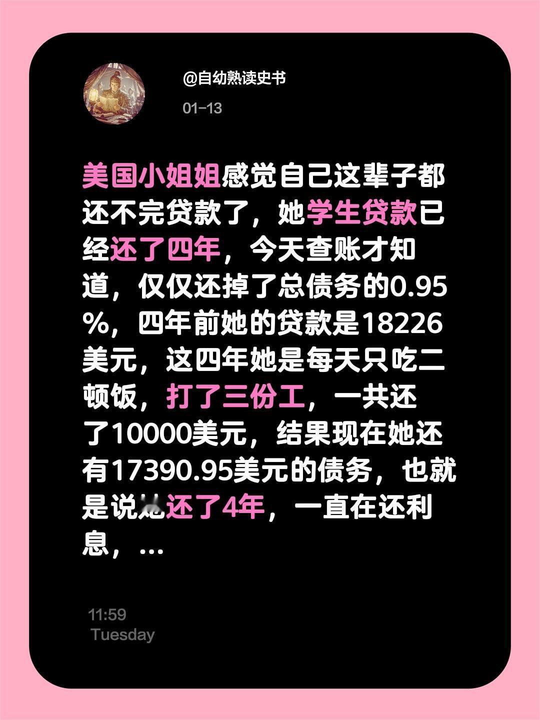 美国的学生贷让你永远还不完!美国小姐姐感觉自己这辈子都还不完贷款了,她学生贷款已经还了四年,今天查账才知道,仅仅还掉了总债务的0.95%,四年前她的贷款是18226美元,这四年她是每天只吃二顿饭,打了三份工,一共还了10000美元,结果现在她还有17390.95美元的债务,也就是说她还了4年,一直在还利息,本金才缩小了不到1%。 银行内部将这种高复利、迟延抵扣本金的模型,称为“常青树”,意味着债务像常青树一样,永远不死。当然,浇灌常青树的就是这些美国老百姓。 美国小姐姐的明白,她奔跑的速度,永远追不上债务膨胀的速度。所谓的“助学”贷款?比真实的高利贷、驴打滚更为狠辣! 这就是资本美国,他们设计了一个系统,确保大部分人,永远在还一笔永远还不清的债。 而像她这样的人,还有数以千万计。