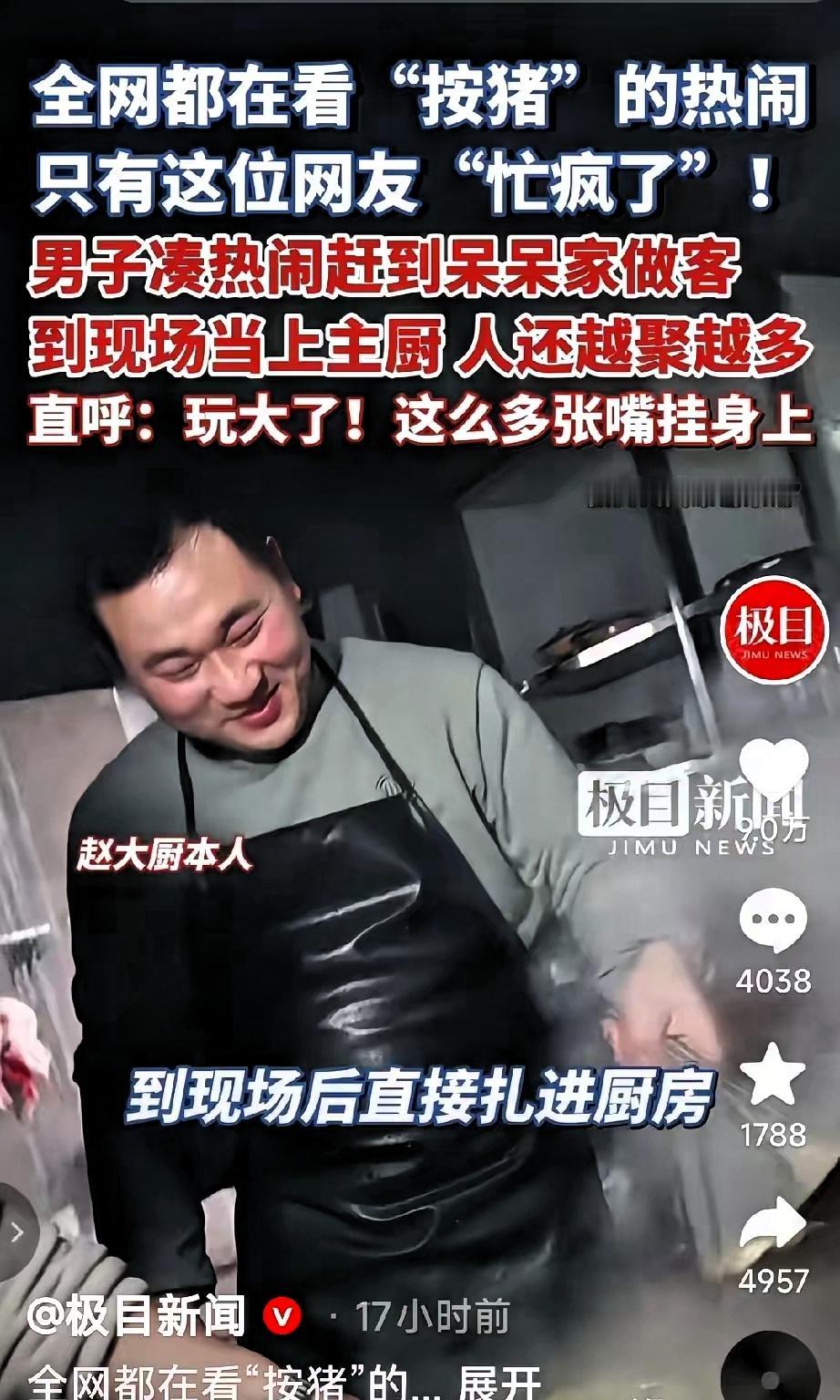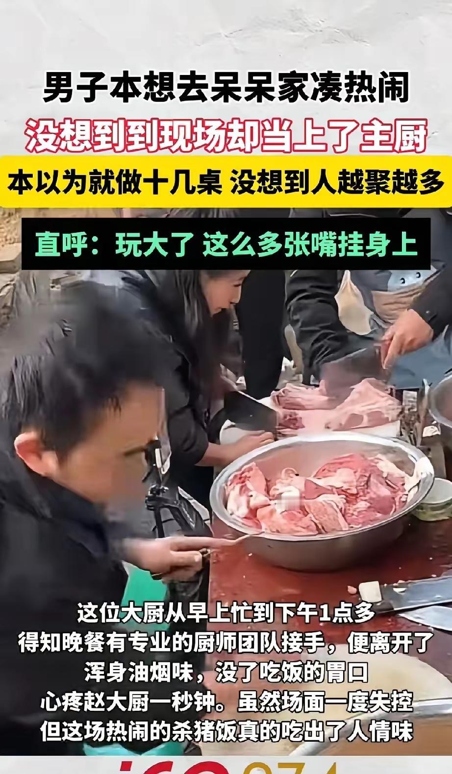 现在全网最糟心的,恐怕就是重庆那位赵大厨了。 他不是因为生意不好,也不是因为家里有事,纯粹是去呆呆家凑个热闹,结果差点把自己累到散架。 赵大厨本来就是去看杀年猪的,到得挺早。看见人山人海,主人家忙不过来,他自己又是干厨师的,索性就主动上手帮忙炒菜。 这一上手,就停不下来了。他本来以为就十几桌人,结果场面完全失控,人越来越多,铲子都快抡出火星子了。 他心里也打鼓,这么多人等着吃饭,责任全落自己身上了。从早上一直干到下午一点多,专业的餐饮团队来了他才解脱。 可那时候他已经一身疲惫,满身油烟味,累得饭都吃不下一口,没吃饭就走了。一个好心帮忙的,最后连口热乎饭都没吃上,这事听着就让人五味杂陈。 赵大厨的经历,其实就是这场“按猪狂欢”的一个缩影。它揭示了这场网络盛宴背后最真实的一面:热情是真热情,但混乱也是真混乱。 呆呆一个随手的邀约,点燃了无数人对“年味”的乡愁,7个邀约群瞬间爆满,这股力量连她自己都始料未及。 这件事最关键的转折点,是当地官方的反应速度。合川文旅不是去制止,而是连夜开会,直接把这场可能失控的闹剧,当成了一次文旅推广的绝佳机会。 他们凌晨两点多就带着设备赶到现场,这已经不是简单的帮忙了,这是把一个民间自发活动,瞬间提升到了官方项目的高度。 如果没有官方下场,后果不堪设想。交通瘫痪、食物短缺、安全隐患,任何一个问题都可能让好事变坏事。 后来央视的车被堵在村口,市公安局长亲临现场指挥交通,这已经说明,事件的规模彻底超出了一个村庄、一个女孩能承受的范围。 所以,这场狂欢能圆满落幕,真正该感谢的,除了呆呆的善良和大格局,还有两股力量。 一股是像赵大厨这样默默付出的普通人,另一股就是反应神速、懂得顺势而为的地方管理智慧。 这件事给所有人都提了个醒。网络能在一夜之间创造奇迹,也能在一瞬间引爆危机。大家真正怀念的,是那种人与人之间不设防的热闹和烟火气。而如何守护好这份热情,让它安全、有序地释放,才是更大的考验。