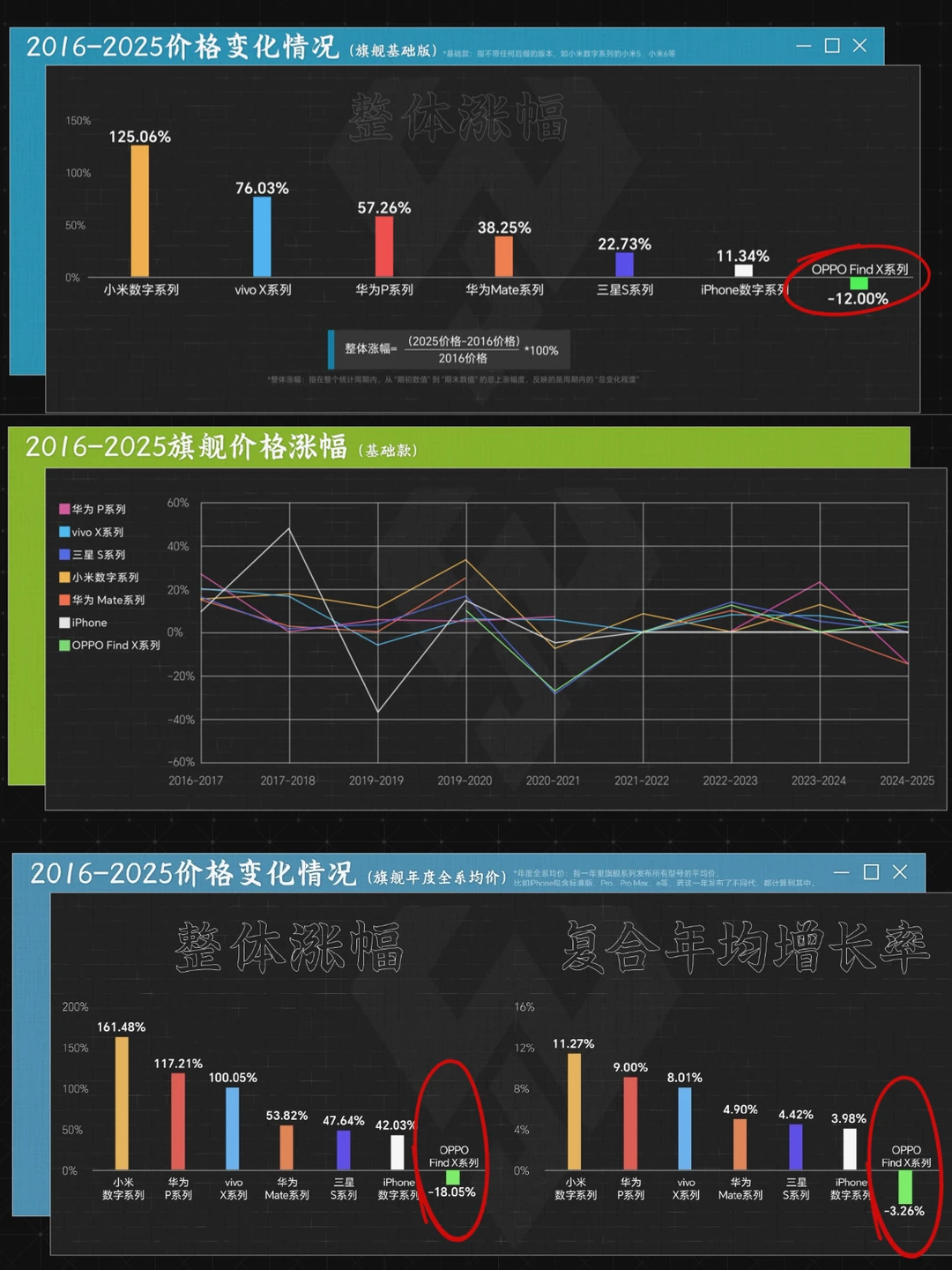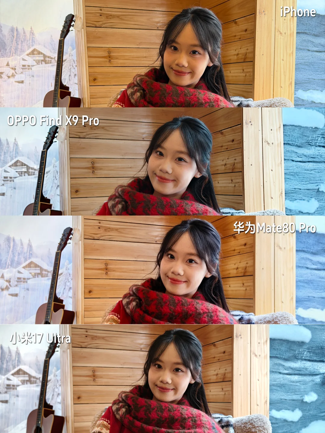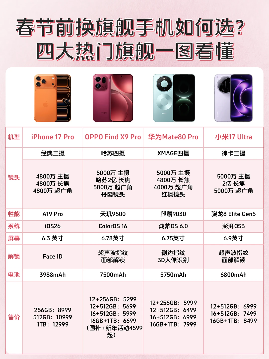 春节也快到了,估计不少小伙伴会在年前换手机,对于还在纠结哪些手机拍照好的同学,我手上正好有几款旗舰机,给大家看看它们拍人像的表现吧~ 📱机型包括 🍎iPhone17 Pro(无国补) 🫧OPPO Find X9 Pro(国补后4599起) 🌼华为Mate80 Pro(国补后5499起) 🟠小米17 Ultra(无国补) (机型看水印,统一默认模式直出) 👉🏻iPhone 17 Pro整体还是真实风格,画面偏黄,皮肤细节保留不错。 👉🏻OPPO Find X9 Pro画面够亮,模特肤色还原真实自然,肤色白皙有血气,人像质感不错。 👉🏻华为Mate80 Pro整体风格和OPPO差不多,肤色还原准确,美颜自然,画面红色更讨喜。 👉🏻小米17 Ultra的徕卡人像风格也不错,肤色美颜不过分,背景还保留了一些暗角细节! 不夸张地说,苹果拍人像确实可以向国产机学习下,比如在肤色还原这块,Mate80 Pro二代红枫镜头,Find X9 Pro有全新丹霞色彩还原镜头,对模特的肤色还原就很准,加上恰到好处的美颜,这会让人像的质感更好,省去大家p图的时间! 所以喜欢拍人像的同学知道怎么选了吧?对了,2026年换手机也是有国补的,像是Find X9 Pro还有200新年限时券叠加,而且送299的礼盒和24期免xi呢!另外,我看了小白测评统计各大手机品牌旗舰的近几年的涨价情况(图7),OPPO不升反降,这还算良心了吧?